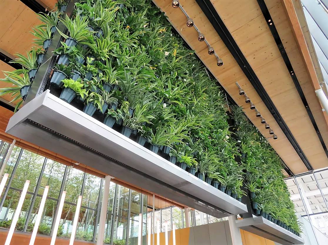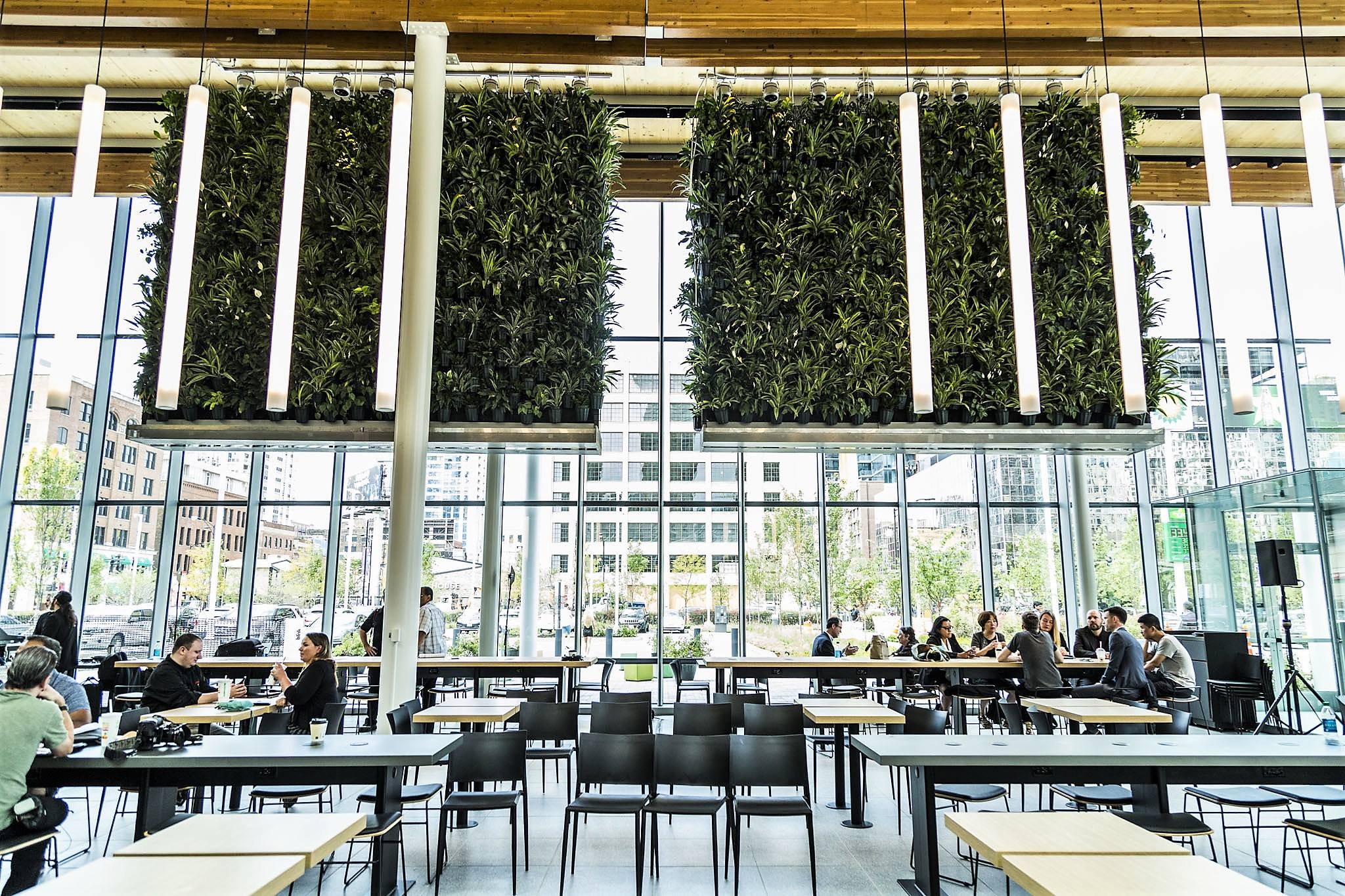 Тема устойчивого развития отражена в ландшафте проекта, «зеленой» крыше, открытых площадках, подвешенными стенами живых растений и «воздушным» стеклянным садом, расположенном в центре здания, с белыми березами и птицами. Растения интегрированы на всей территории заведения, а также внутри здания. Теперь посетители ресторана могут расположиться прямо под каскадными зелеными стенами, подвешенными к потолку. Углубленная зеленая крыша посреди ресторана открывает гостям вид на деревья и растения. Специалистами была разработана запатентованная почва, чтобы обеспечить рост и развитие растений в урбанистическом оазисе. Скоро на территории ресторана откроется патио.