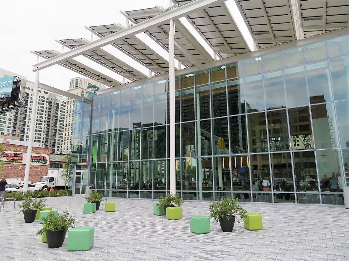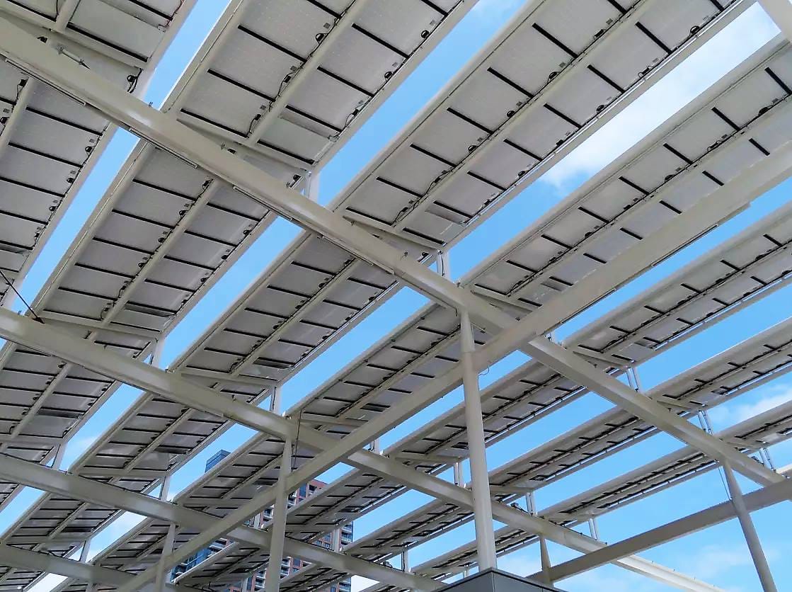 Зазубренная пергола накрывает периметра здания. На стальных рамах крыши установлены 1062 солнечные панели. Они будут генерировать до 60% потребностей в электроэнергии. Сам ресторан спроектирован с учетом уменьшения потребления электроэнергии на 50%, по сравнению с обычным.