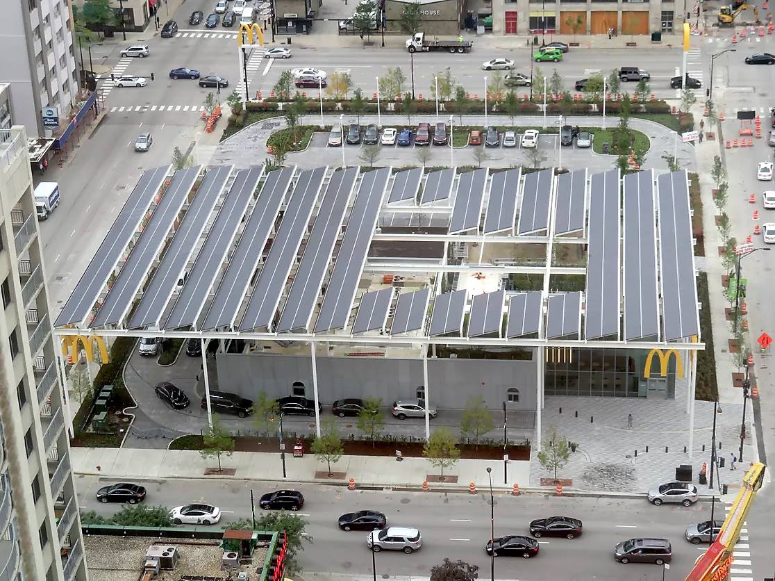 Студия архитектуры, городского дизайна и ландшафта Ross Barney Architects разработала проект флагманского ресторана McDonald's, в рамках будущего ребрендинга сети. За 13 месяцев был концептуализирован футуристический дизайн и завершено строительство современного заведения с акцентом на технологии и устойчивого развития. Новый солнечный ресторан демонстрирует высокотехнологичное устремление бренда в будущее.