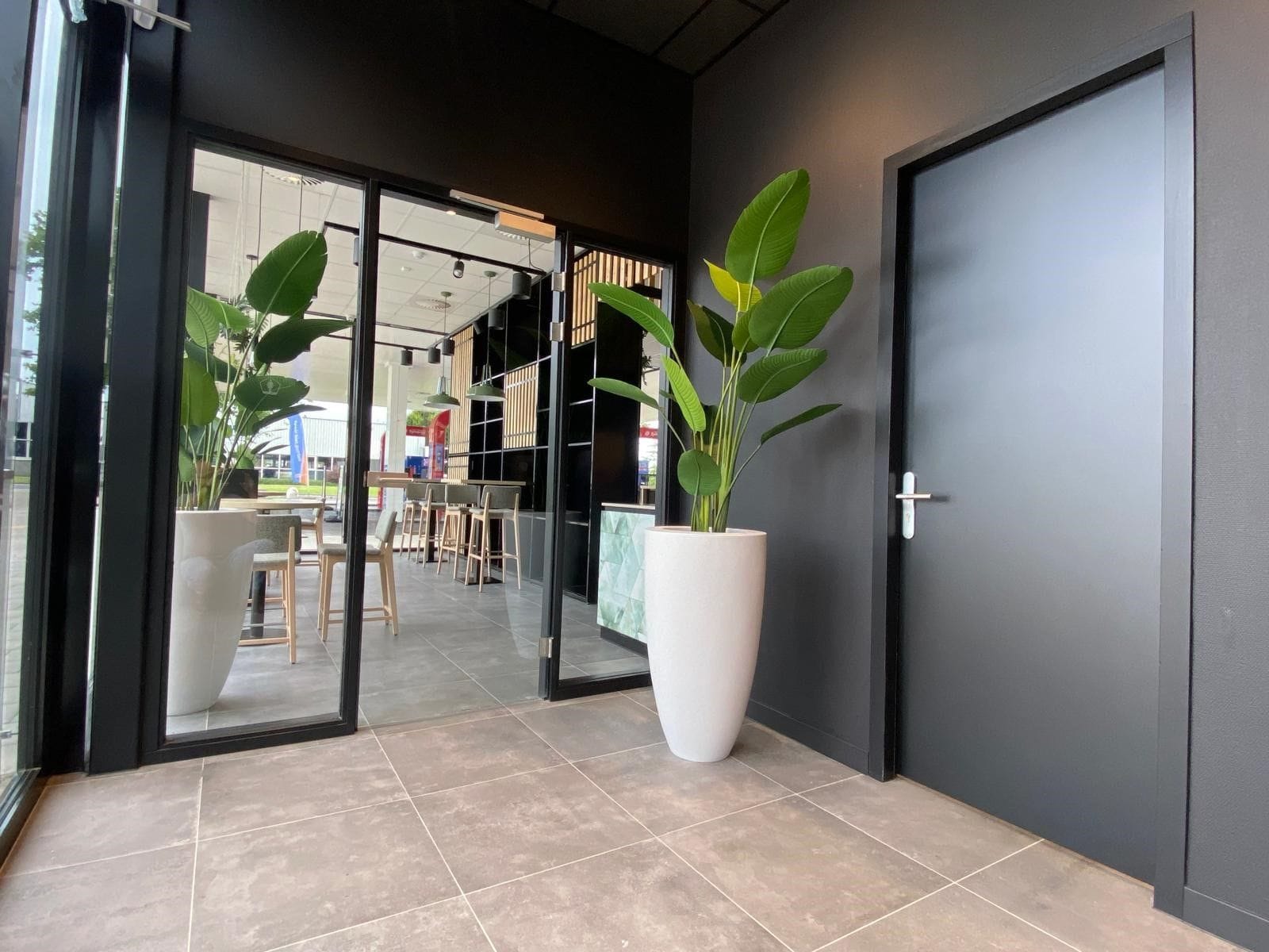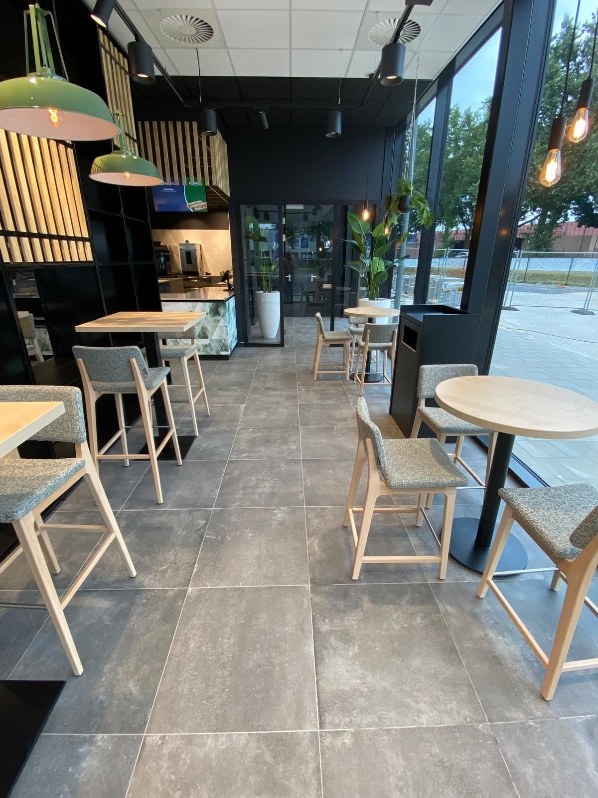 Обновленный интерьер выглядит современно и привлекательно. В магазине Effe Lekker просторные и светлые помещения с большими окнами и уютными столиками, создающими комфортную атмосферу для перекуса. Стильный дизайн и зеленые растения дополняют интерьер, делая его еще более уютным и приятным для посетителей.