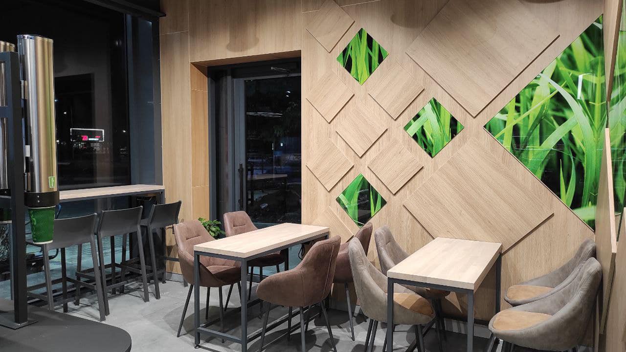 Для отделки интерьера использованы натуральные материалы с вкраплениями элементов в фирменных зеленых цветах WOG. Все для того, чтобы обеспечить гостям дополнительный комфорт во время пребывания на автозаправочном комплексе.