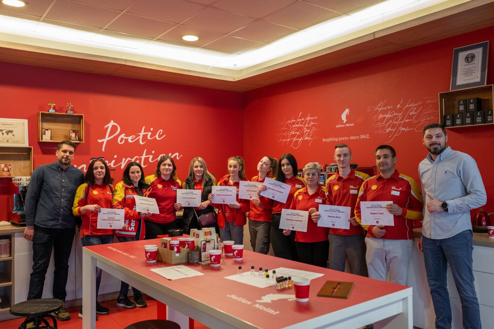 Под умелым руководством профессиональных бариста Julius Meinl, сотрудники сети АЗС работающей под брендом Shell, еще больше усовершенствовали свои навыки приготовления кофейных напитков и получили по успешному окончанию обучения за это дипломы. Кроме того, на мероприятии разработали новый вкус любимого летнего кофе Freddo, и скоро все клиенты смогут им насладиться, приобретя его на автозаправочных станциях.