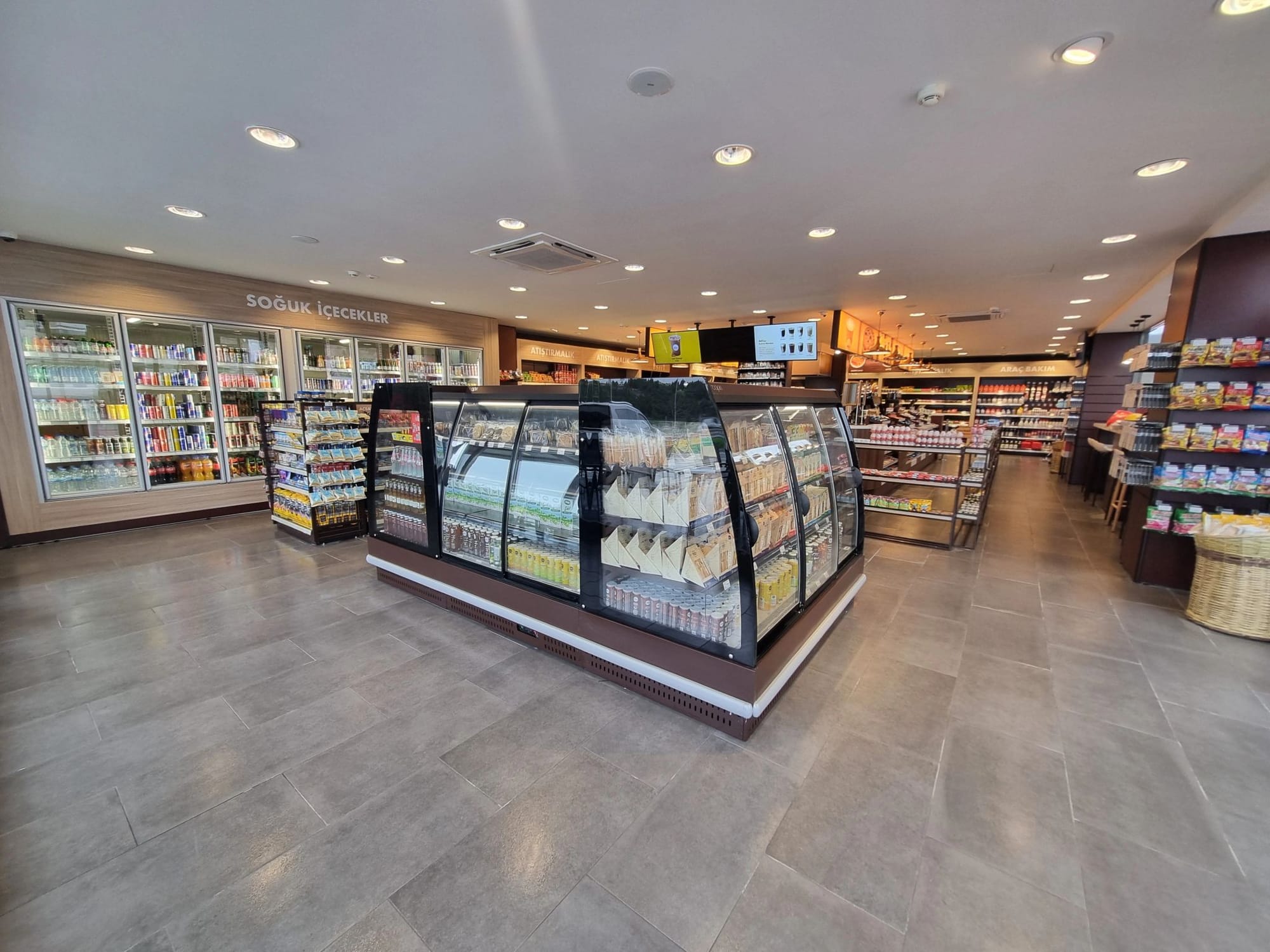 Естественно, главным является центральный остров, где разместили с разных сторон кассовую зону, кофе-корнер, холодильные горки.