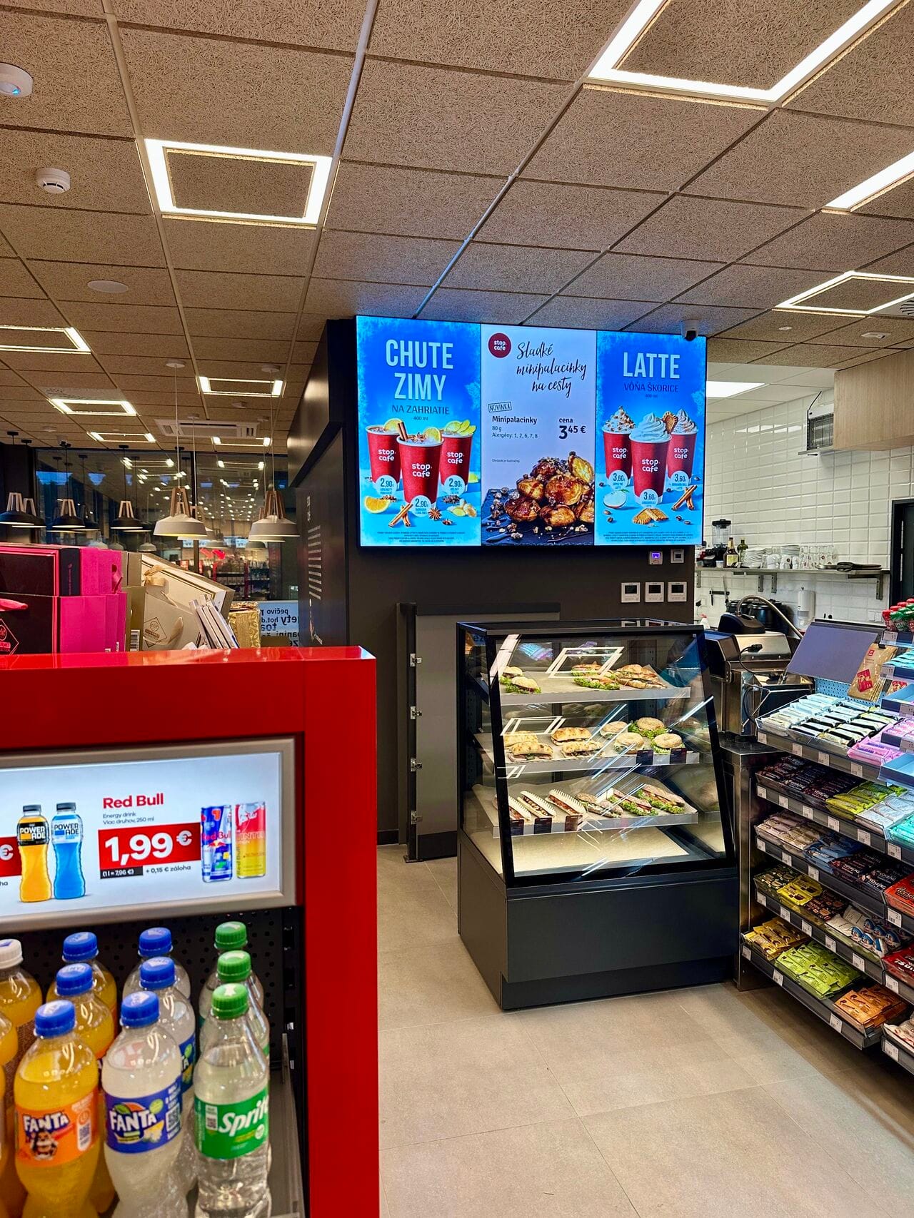 Тут же рядом, прямо на уровне глаз расположили видеостену — современные цифровые экраны с динамичным контентом, которые делают предложение ярким и привлекательным и значительно улучшают ориентацию клиента при выборе.