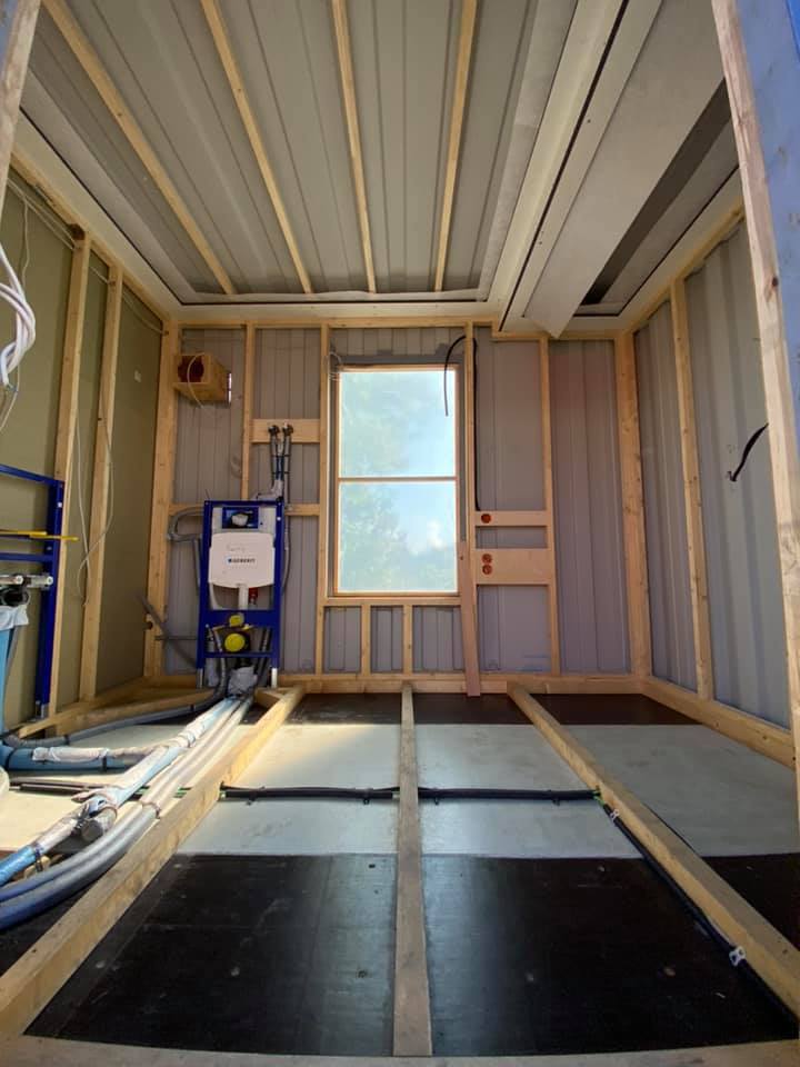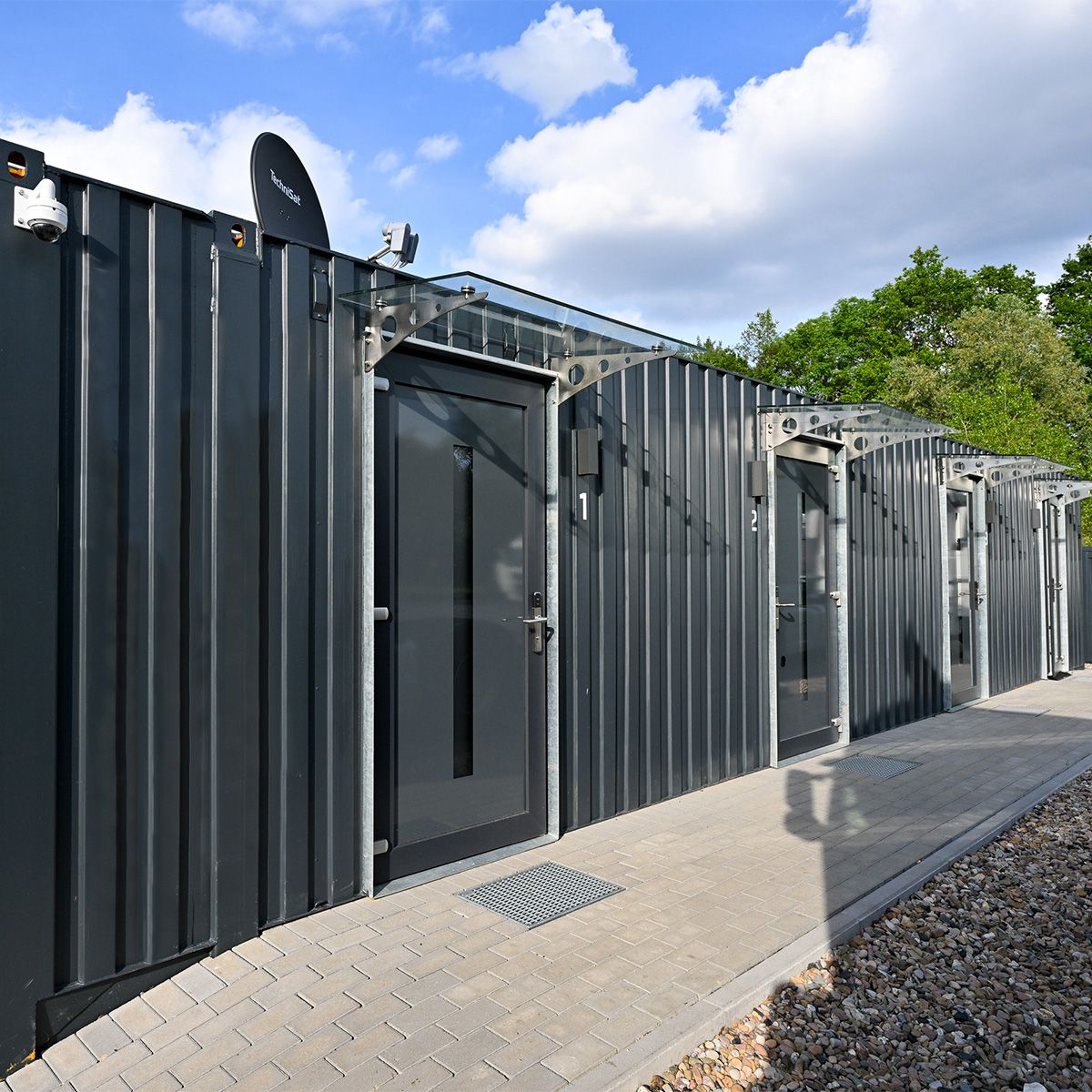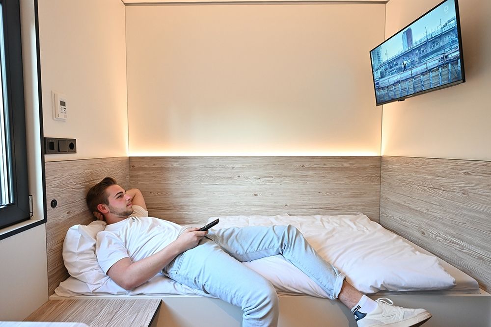 Контейнер площадью 30 квадратных метров имеет четыре одноместных номера с отдельными входами, расположенными рядом друг с другом. Каждый номер тепло- и звукоизолирован, и имеет собственную систему кондиционирования и удобную мебель. На семи квадратных метрах разместилось все необходимое: кровать 90 на 200 см с удобным матрасом, телевизор над ней, душевая ниша, умывальник и унитаз.