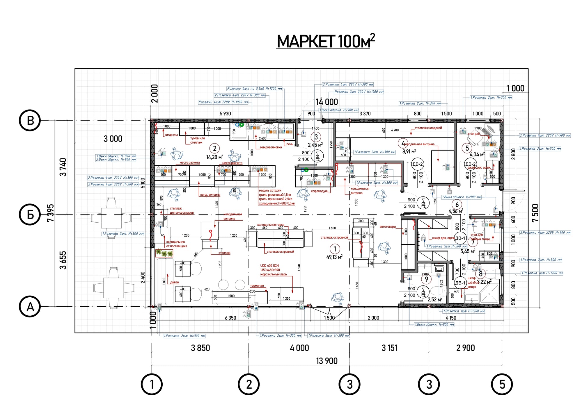 Разработка планировочного решения здания площадью 100 м2. Технологический проект расстановки мебели и оборудования. Комплектация торговым оборудованием.