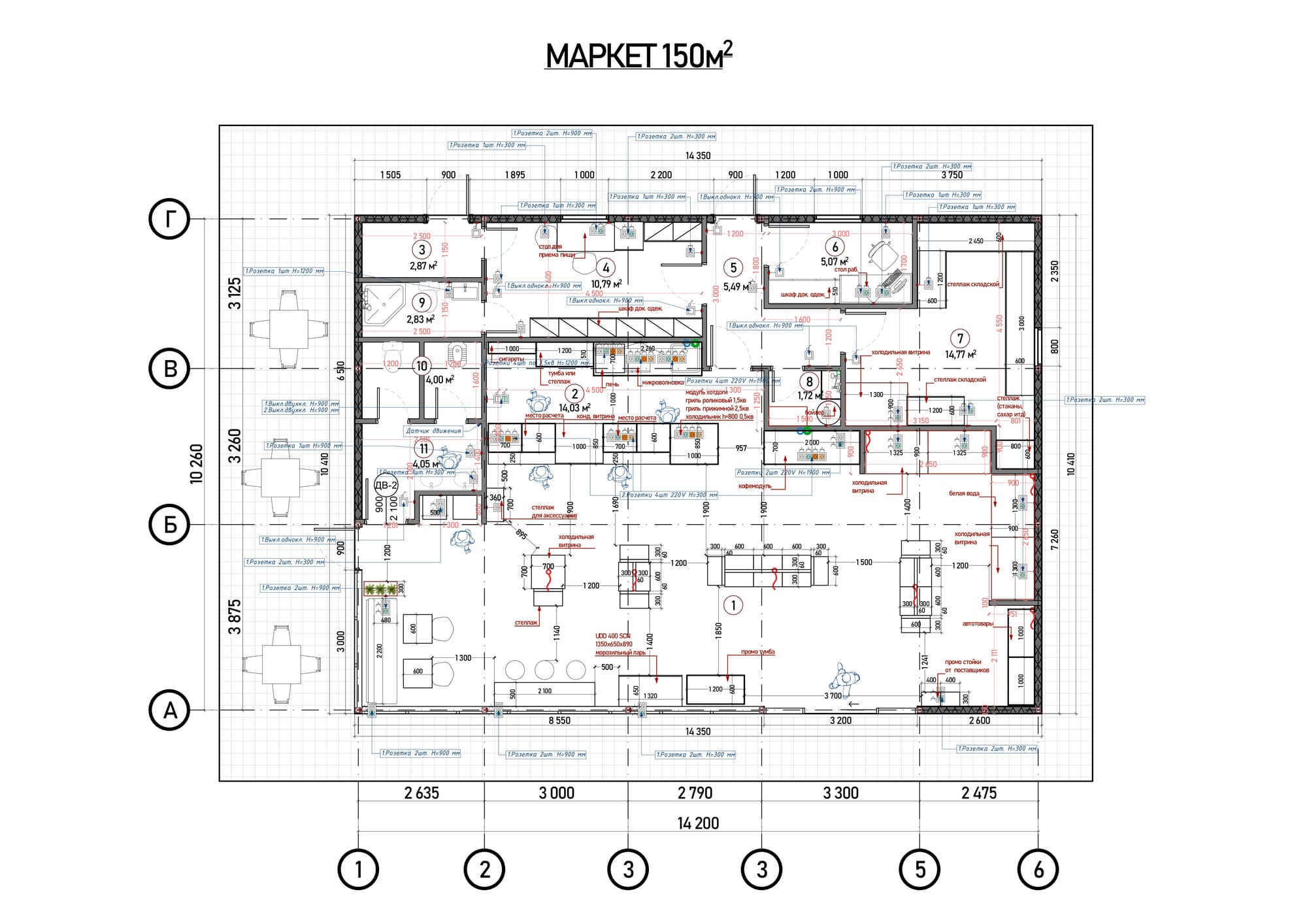 - Планировка и функциональное зонирование здания выполнены с учётом строго заданных габаритов по генпланам. Продумано направление потоков покупателей, точки взаимодействия, а также эффективное размещение товарных категорий и функциональных зон.