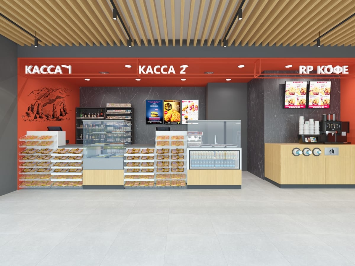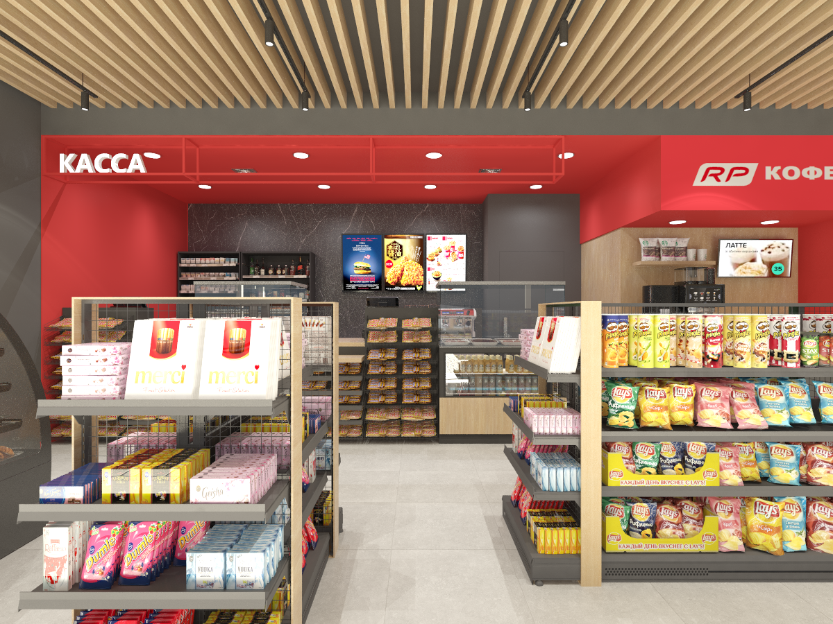 - Разработаны дизайн-решения и визуализации ключевых зон: кассовых модулей, двух кофемодулей, холодильной зоны, навигации, цифровых меню и др. Подготовлены технические задания на комплектацию: стеллажи, холодильное оборудование, мебель.