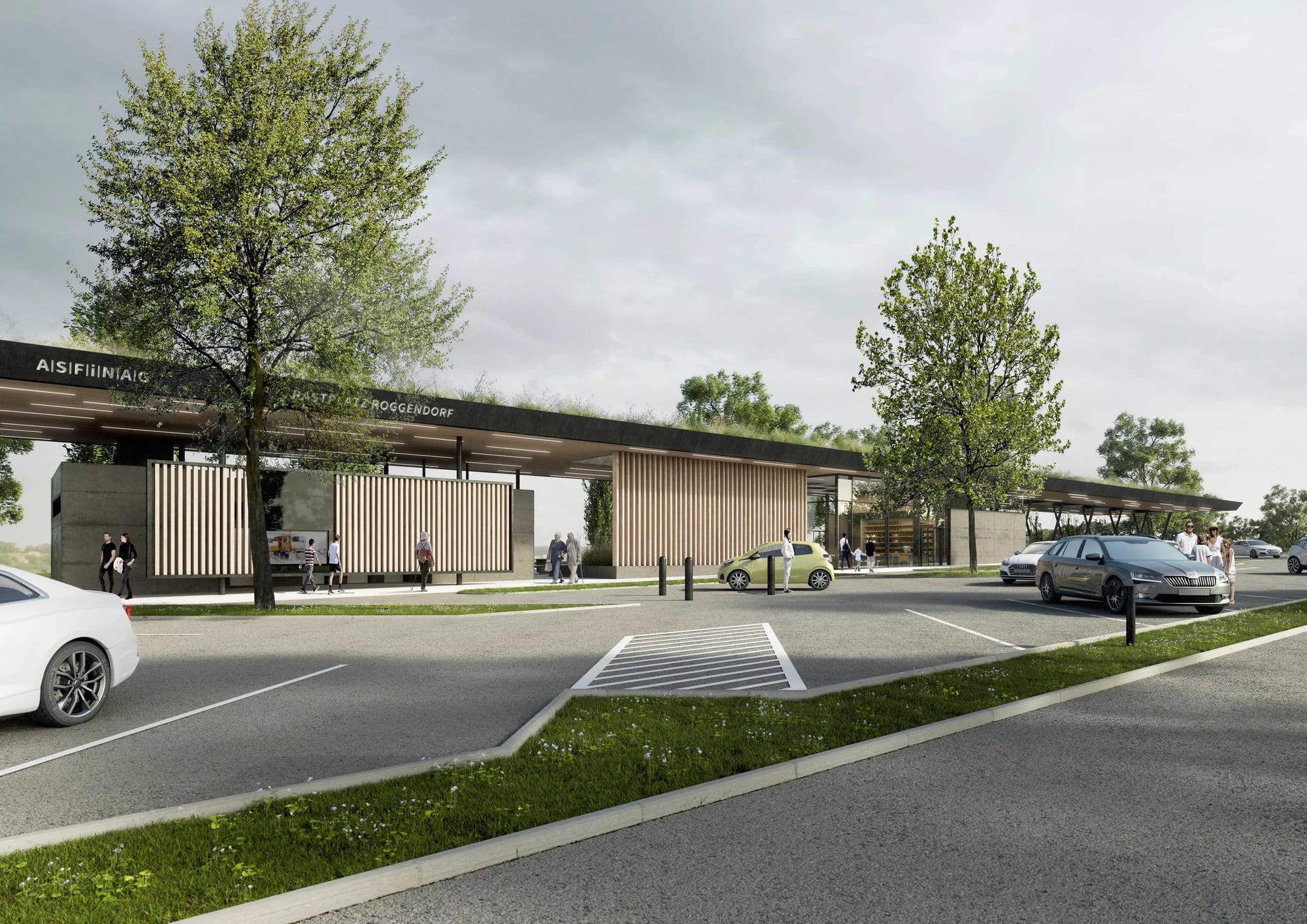 Фасады инфраструктурного ряда также имеют деревянные элементы. Зеленая крыша зоны отдыха площадью 1500 квадратных метров также сделана из дерева. Зеленые элементы, такие как решетки и горшки для растений, интегрированы во внешнюю жилую зону. Для посадки на всей территории используются только местные породы деревьев и кустарников. В целом зона отдыха будущего спроектирована, как зеленая зона площадью около 6000 квадратных метров. Сюда входят места для отдыха, детская игровая площадка, а также площадка для выгула собак и фитнес-тропа. Как и во всех 58 существующих зонах отдыха ASFINAG, в Роггендорфе также доступен бесплатный Wi-Fi и питьевая вода из труб или трех фонтанов с питьевой водой.