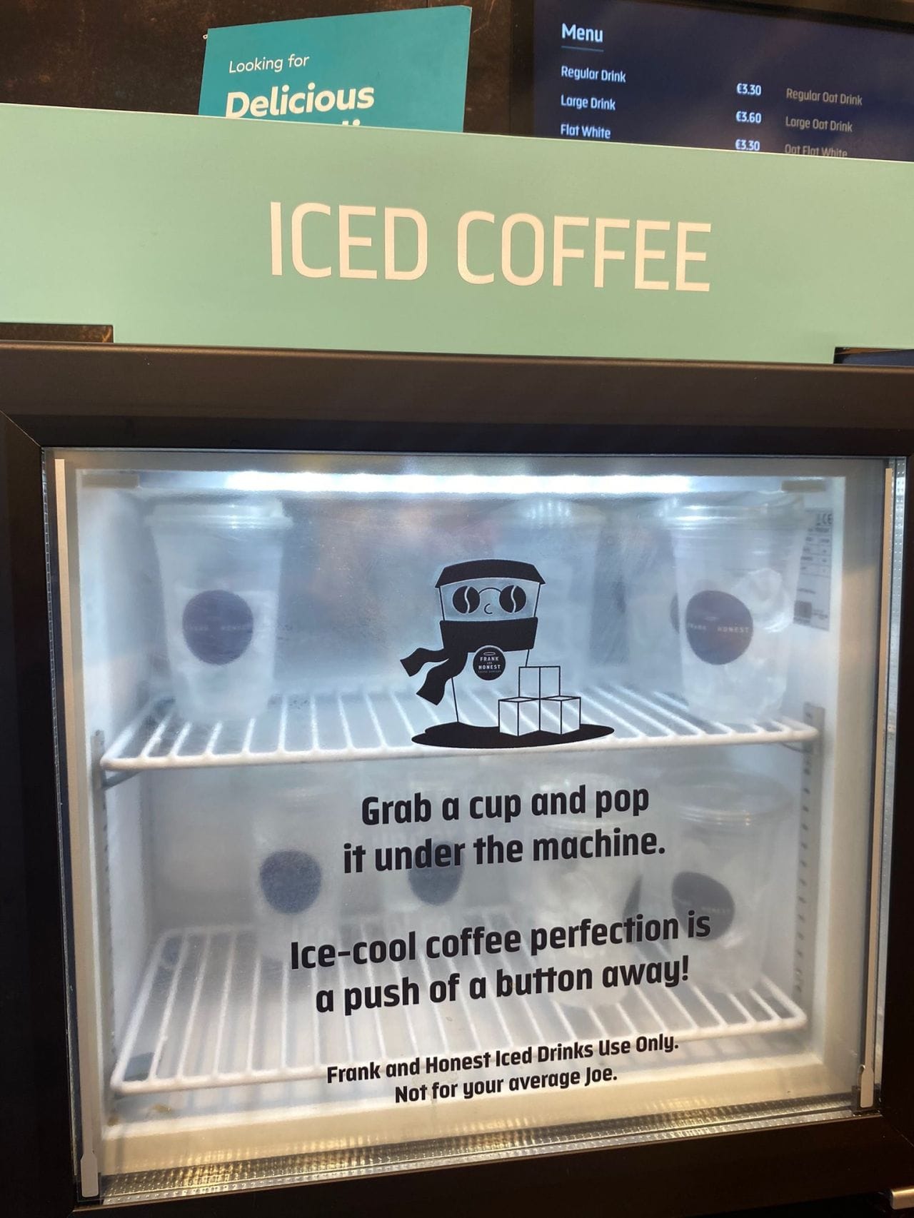Привычный визуальный маркер категории iced coffee в навигации — светло-голубой оттенок, ассоциирующийся со льдом, помогает сразу сориентироваться, где взять стакан. На дверце морозильника наклеена прозрачная плёнка, имитирующая запотевшее стекло — с лёгким матовым эффектом и каплями конденсата, будто поверхность покрыта инеем и от неё словно веет холодом.