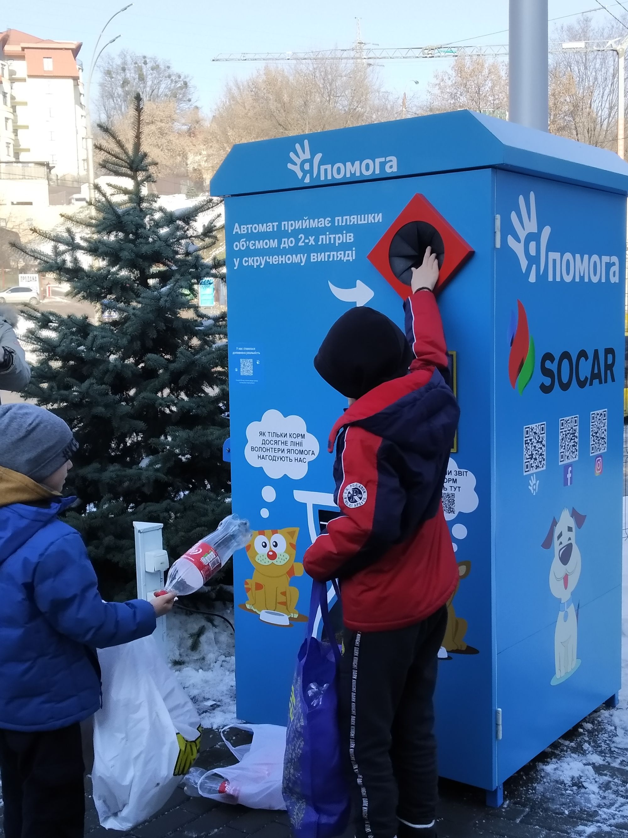Второй Япомогабокс установили на автозаправочном комплексе SOCAR в Киеве (ул. Протасов Яр, 15, возле горнолыжного комплекса). Автомат для сбора использованной тары, за каждую пластиковую бутылку (до 2 л) в специальную емкость высыпает корм для бездомных собак и кошек.