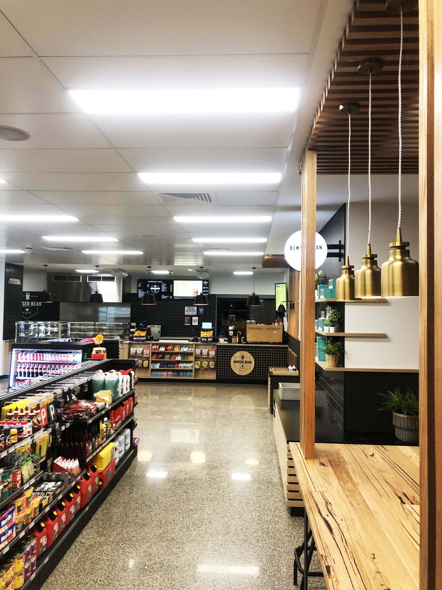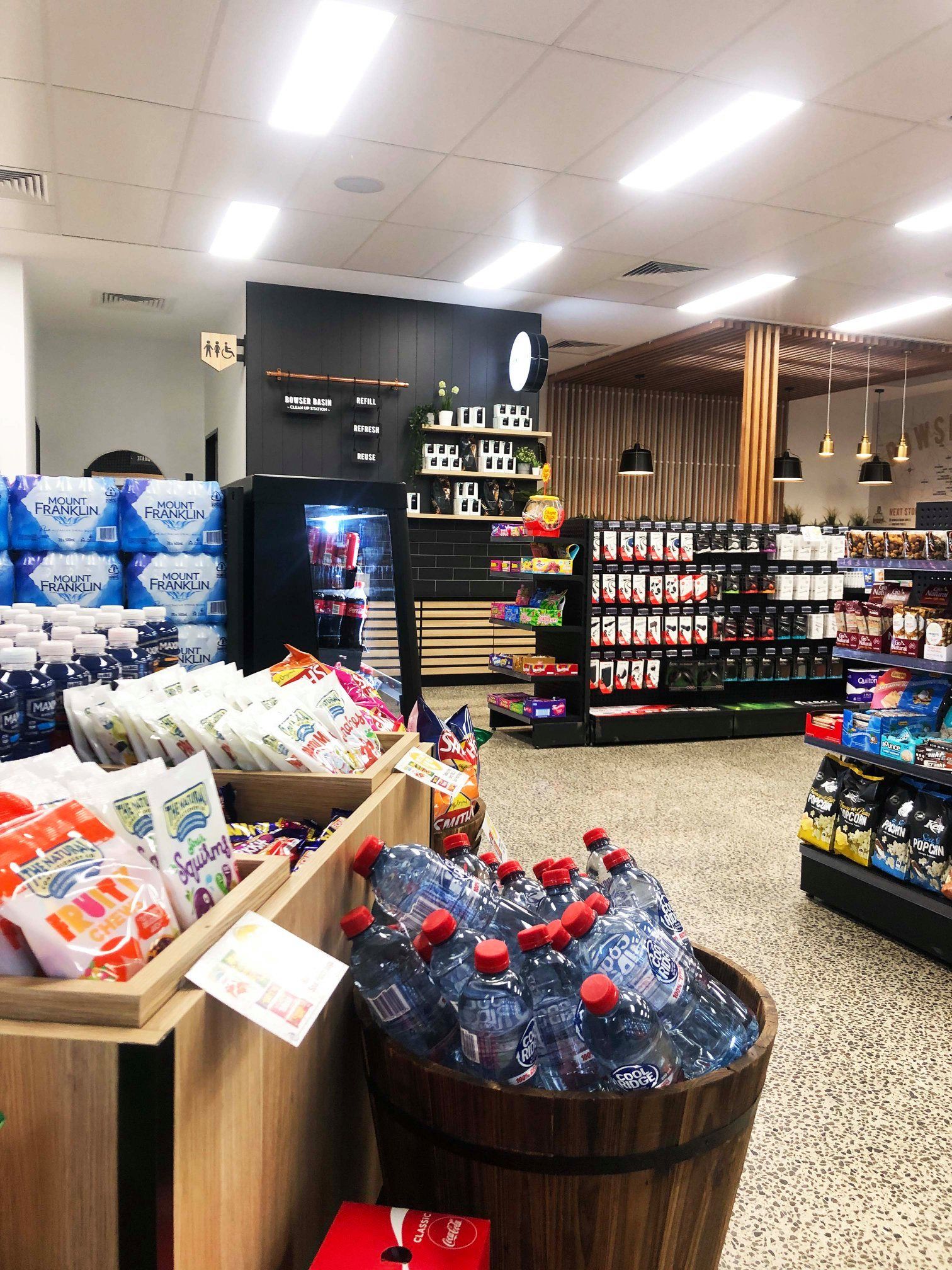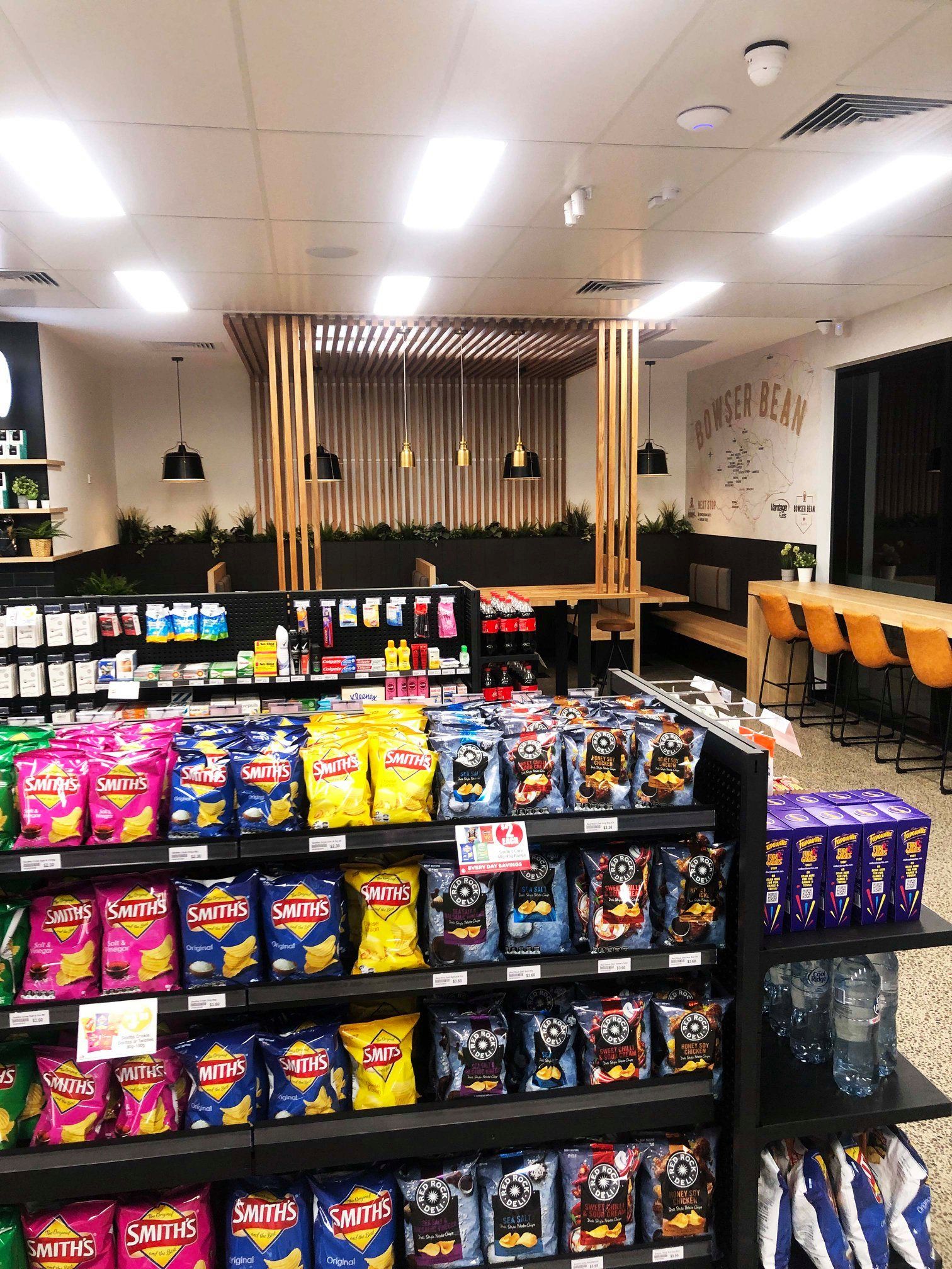 Отличный кофе, широкий выбор готовых горячих и холодных блюд, продуктов и напитков, автоаксессуаров, дрова, лед, карты системы платных дорог City Link, телефонные карты, газовые баллоны для барбекю, лицензии на рыбалку и прокат трейлеров.