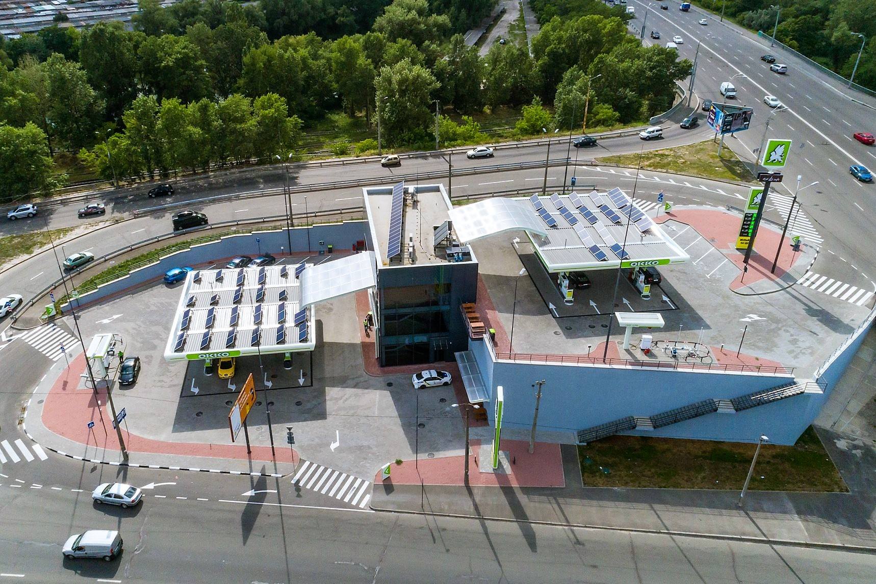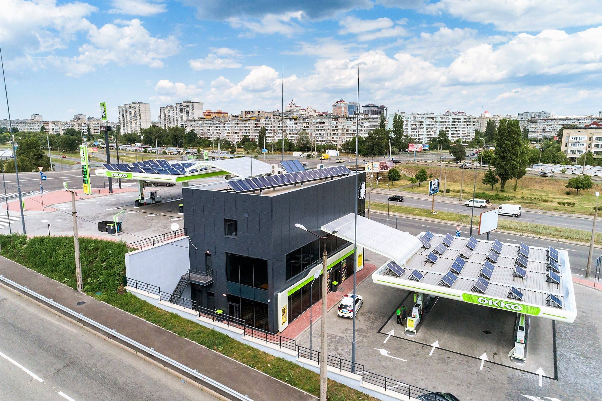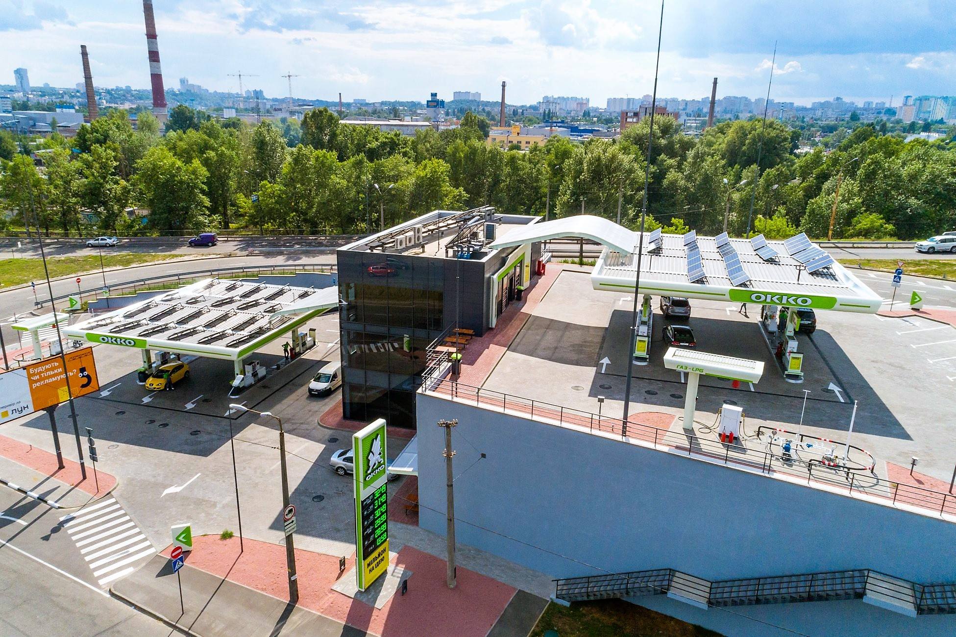 В Киеве сеть ОККО открыла самый высокий в Украине 2-х уровневый автозаправочный комплекс с 3-этажным зданием операторской. Общая высота помещений достигает 13 метров. Это стало возможным благодаря смелому архитектурному решению и удачному расположению АЗК. Объект располагается на нескольких уровнях в центре большой транспортной развязки и одновременно обслуживает две магистральные автомобильные дороги, которые пересекаются на разной высоте.