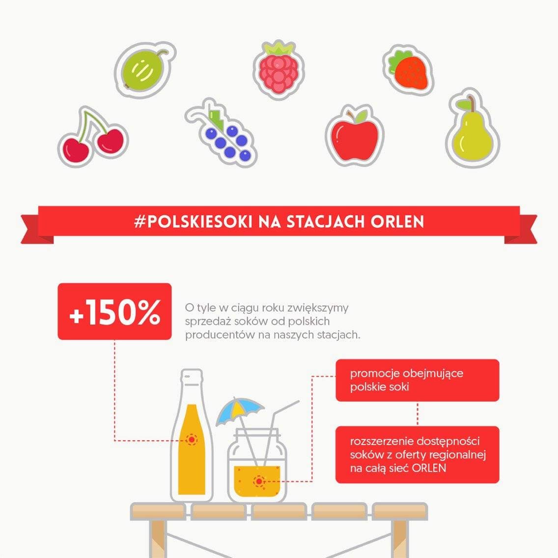 Летом 2018 года стартовал проект Polskie Soki. Программа направлена с одной стороны для поддержки местных фермеров, с другой - полностью отвечает запросам потребителей. Как результат, продажи соков на автозаправочных станциях значительно выросли. Всего за год Orlen планирует увеличить продажу соков польских производителей на своих АЗС на 150%. Продавать соки будут также на заправках магазин в Чехии и Германии.