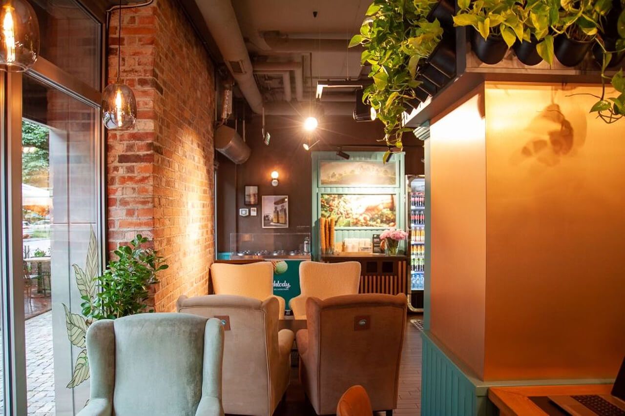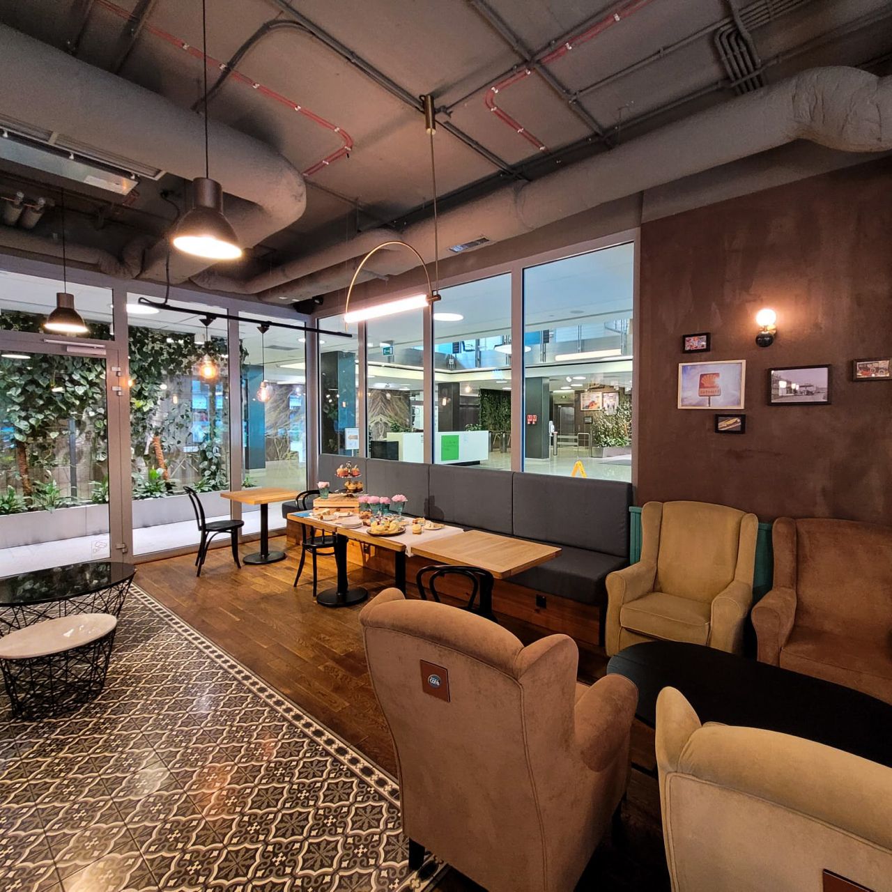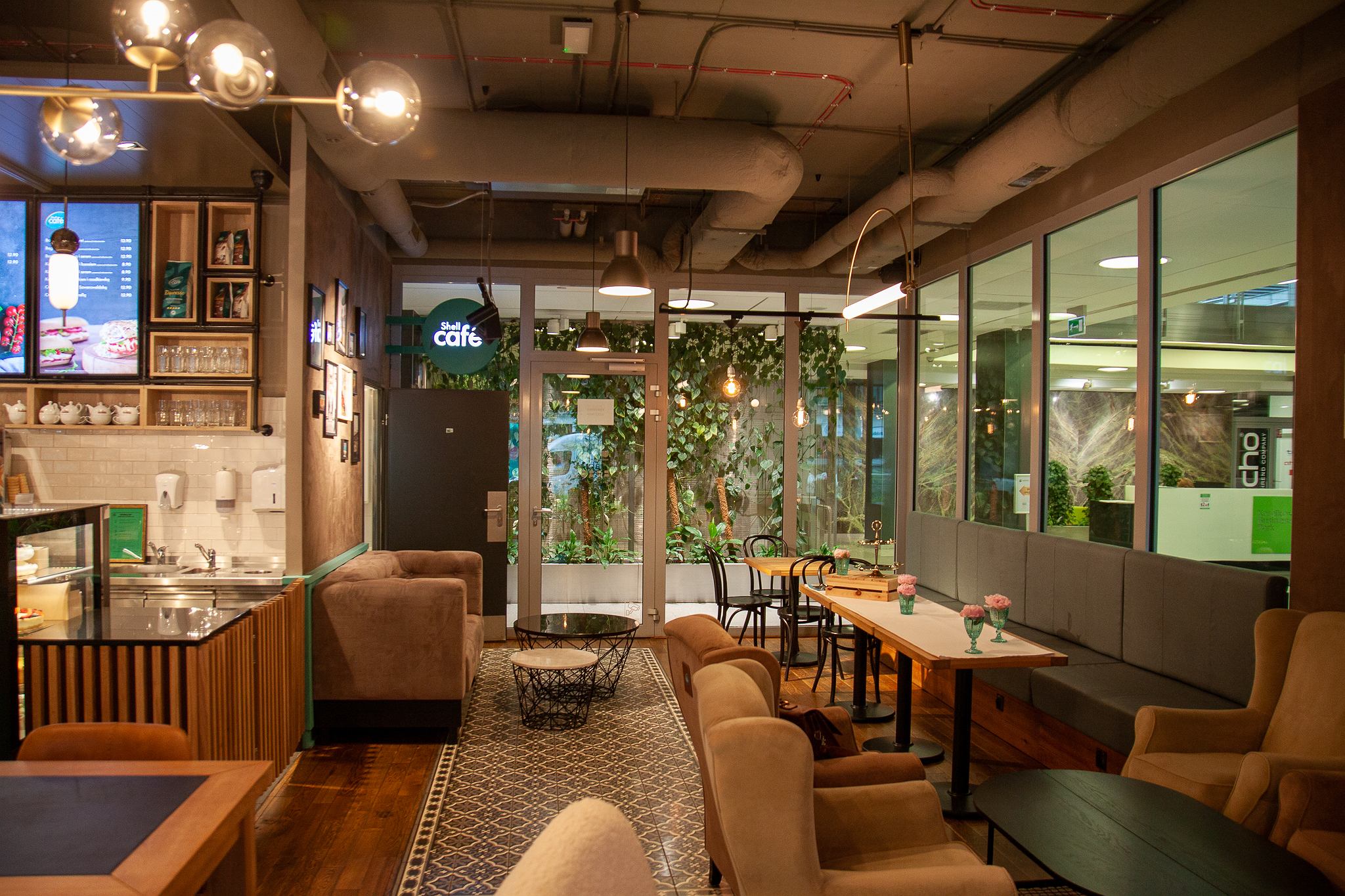 Использование тканей высочайшего качества для оформления интерьера укрепляет имидж Shell Café, как места премиум-класса. Теплые тона, дерево и удобные мягкие кресла создают уютное пространство, располагающее как к расслабляющим личным, так и к деловым встречам. Отдельная секция кафе создает идеальные условия для обучения или презентаций.
