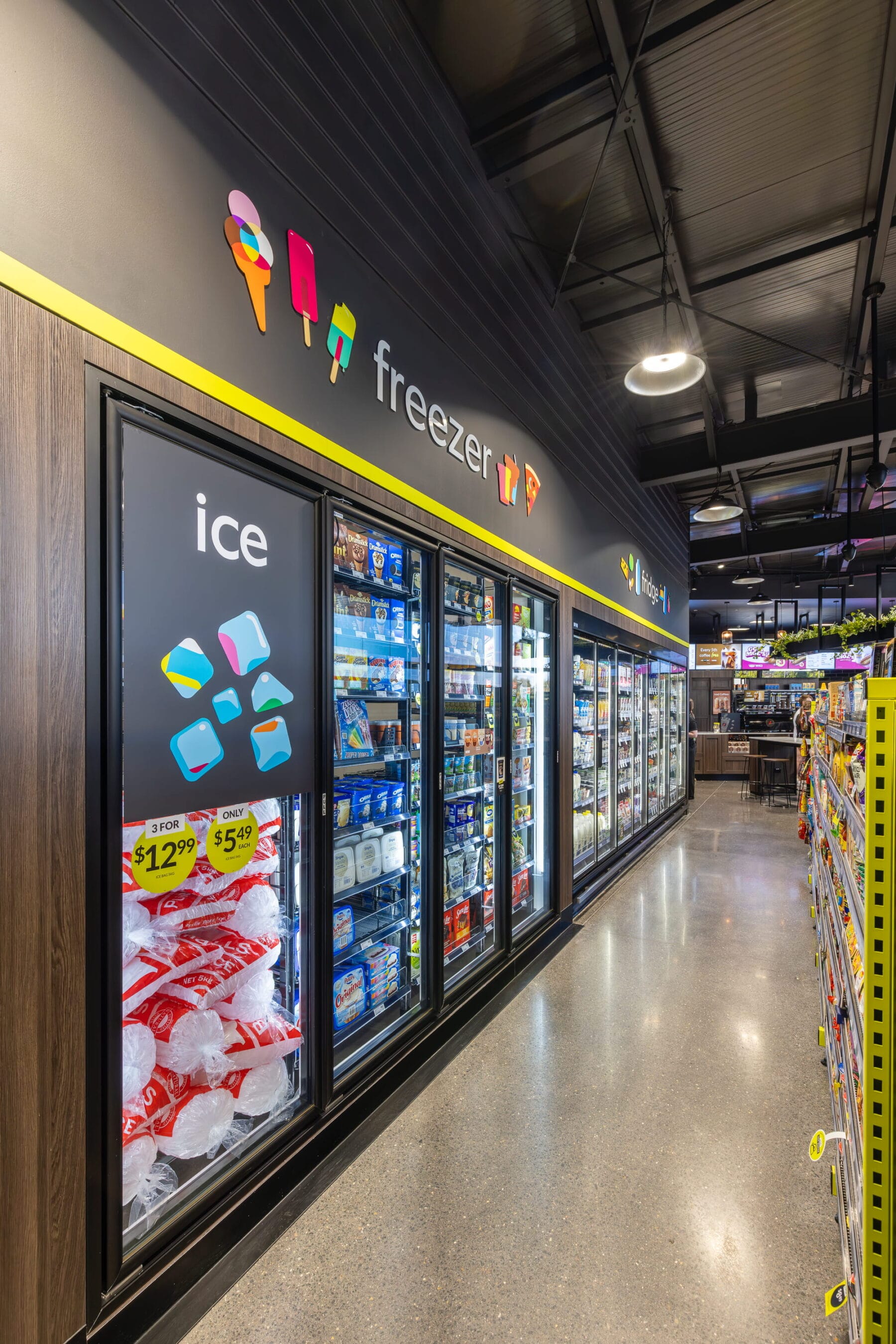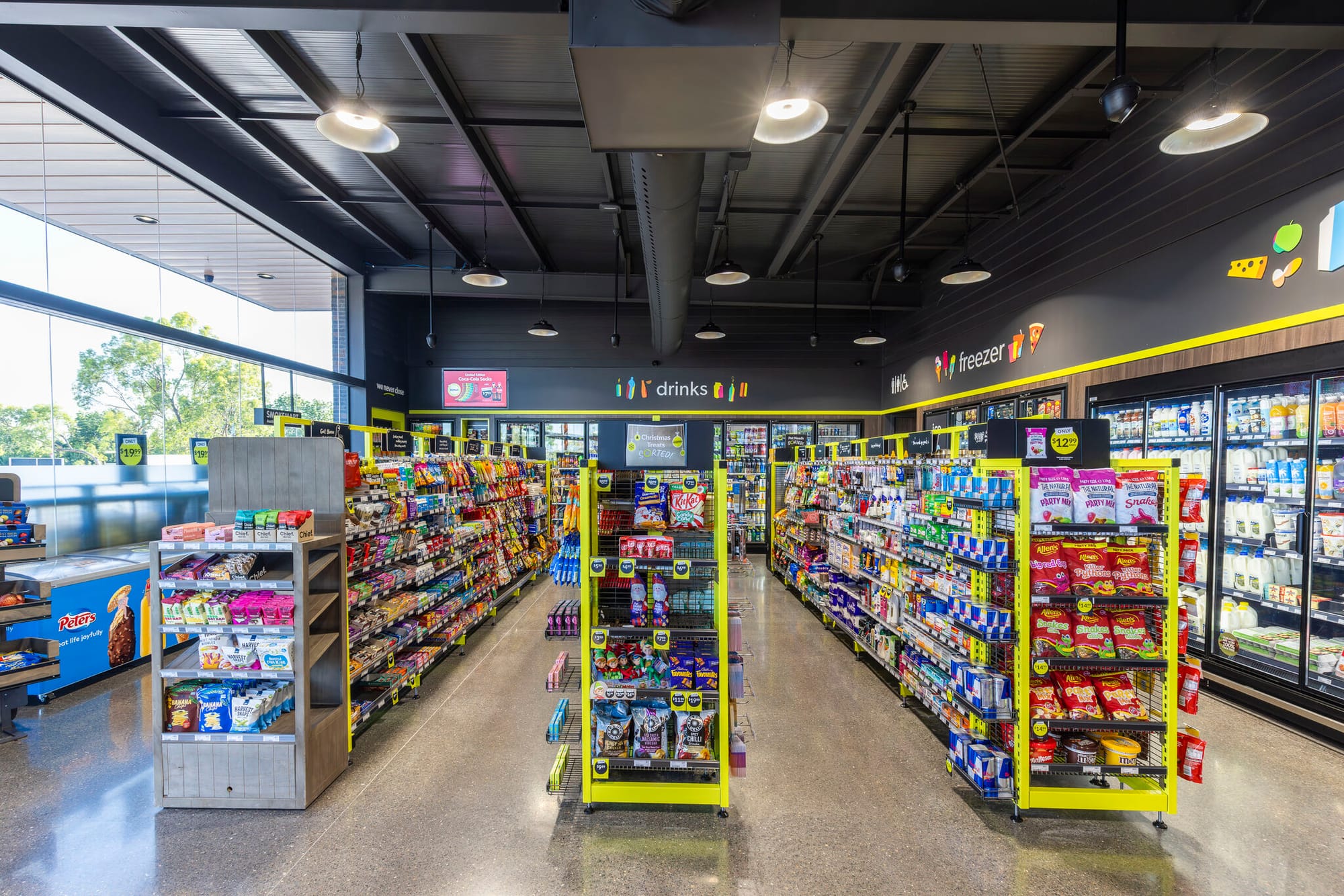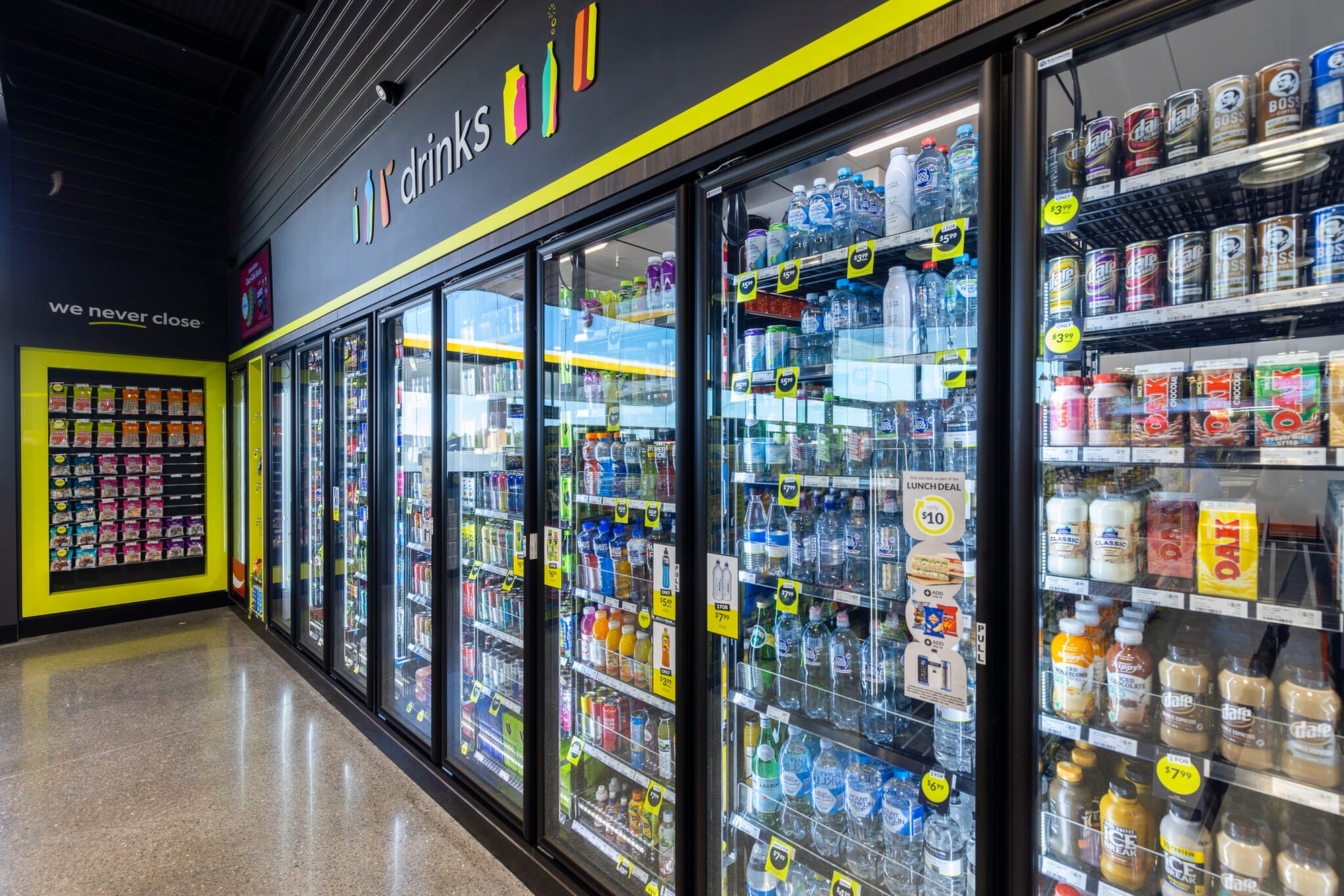 Линия холодильников под углом направляет к санузлам. Категория охлаждённых напитков — как якорь в самом углу. Хорошо комбинируются секции и модули в торговом зале. Возможно, использование фирменного лимонно-зелёного цвета немного отвлекает от товаров на полках?