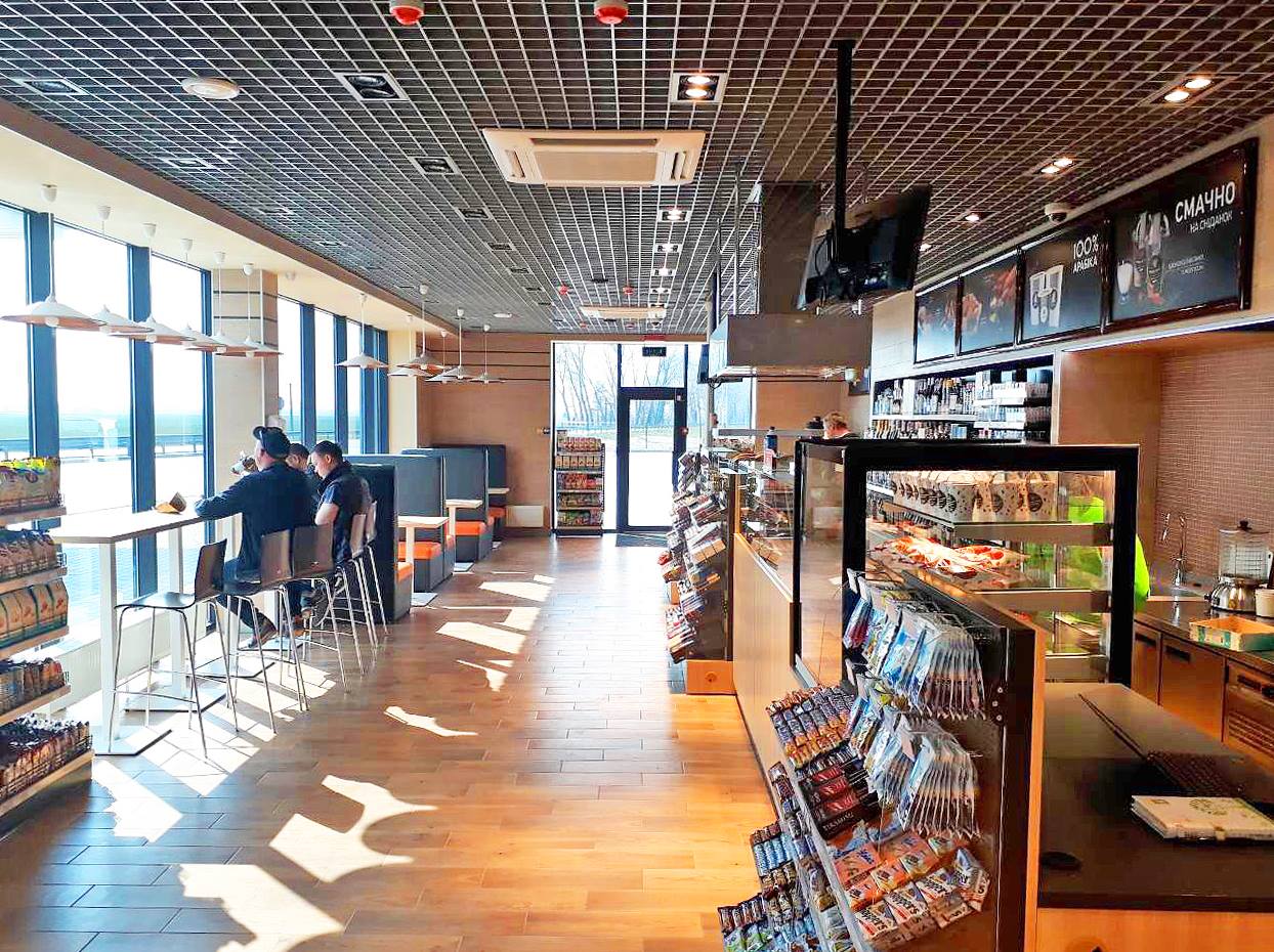 В составе комплекса открыто кафе и магазин с широким ассортиментом товаров, общая площадь зала составляет более 100 квадратных метров.