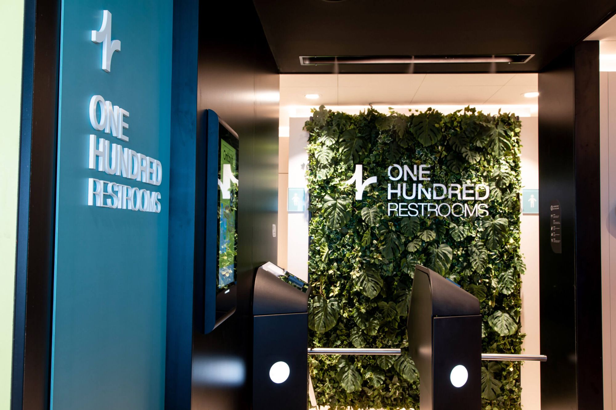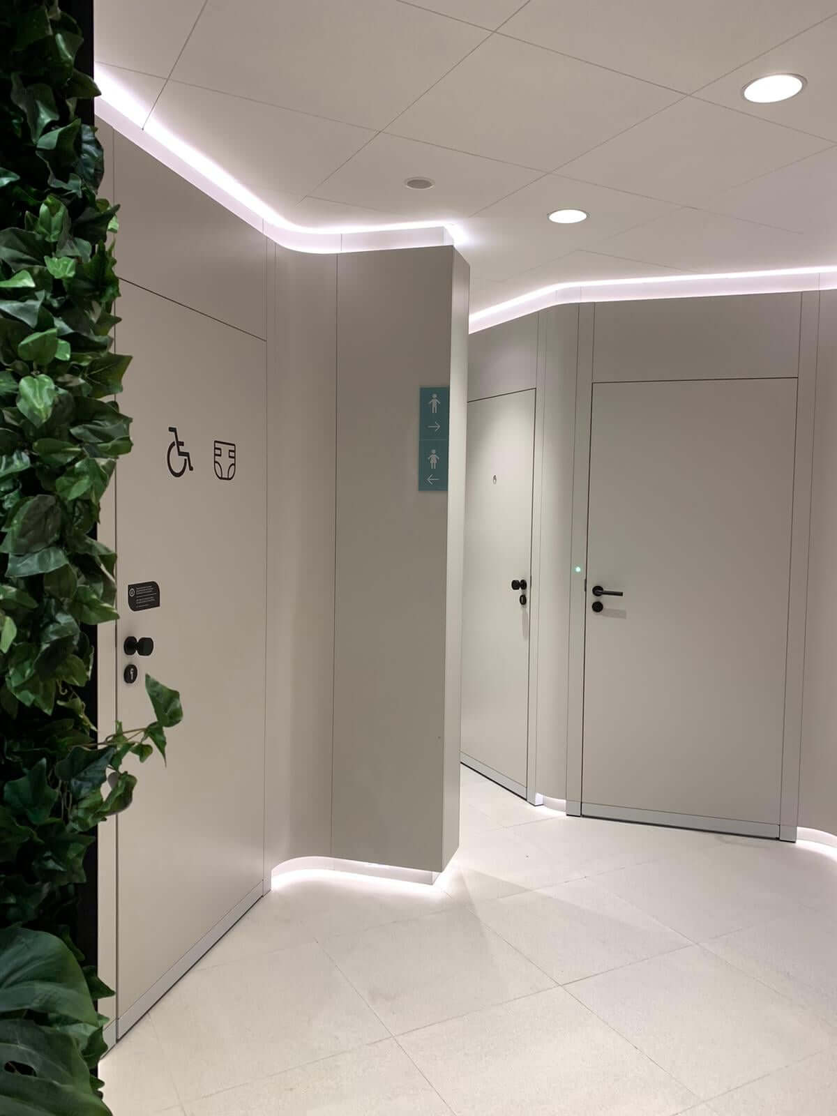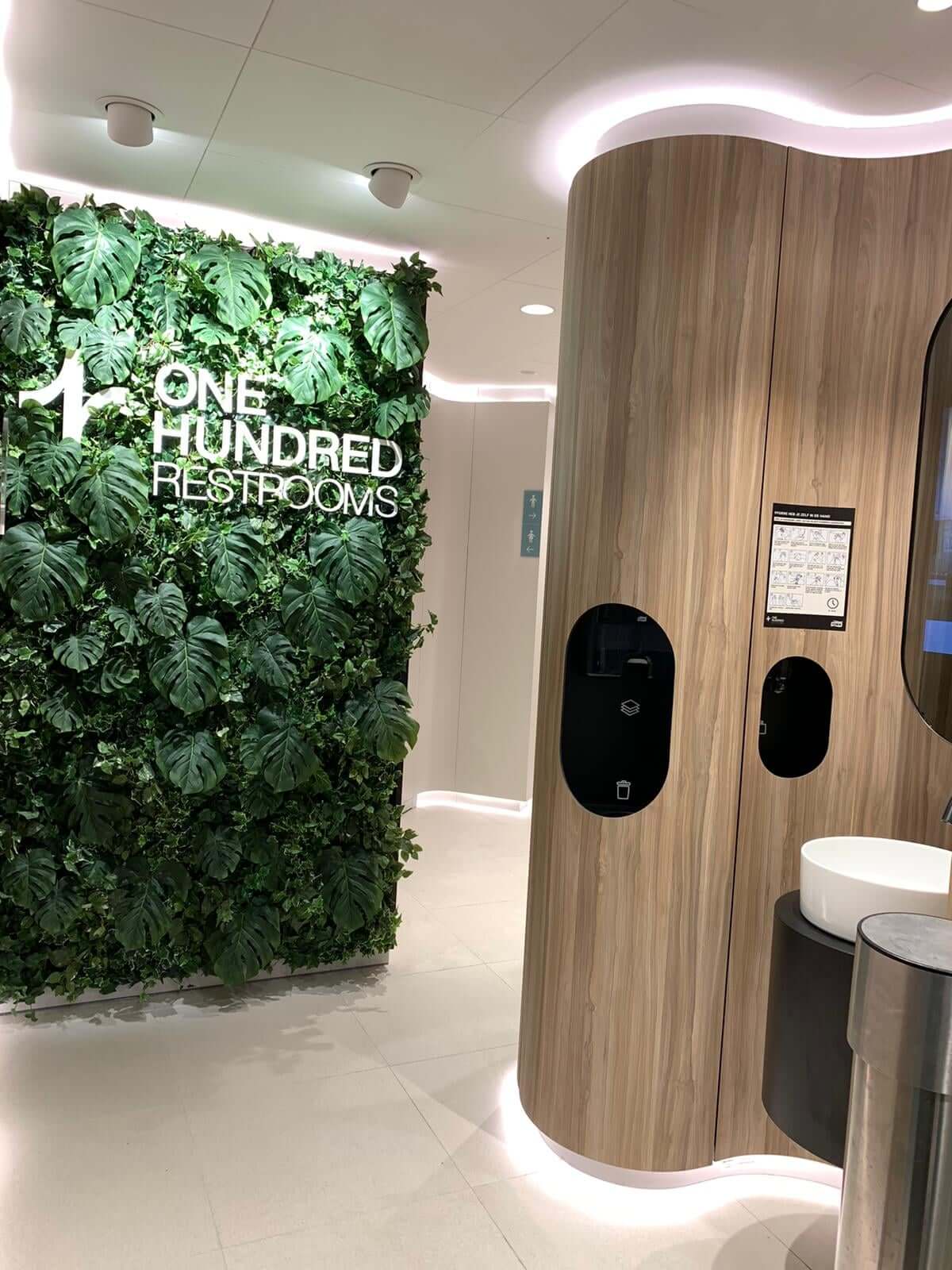 В туалетах установлены гигиенические бесконтактные решения – сенсорные дозаторы мыла, смеситель для воды, унитаз/писсуар. Ведется постоянный мониторинг и обслуживание, включая расходные материалы, инструмент оценки клиентов. Индикаторы присутствия – зеленый или красный светодиодные датчики, показывают, занята ли кабинка туалета. В помещении создано ощущение полного комфорта и релакса с помощью применения натуральных материалов и зелени, свежих ароматов, звуков птиц, зеленой стены, непрямого освещения.