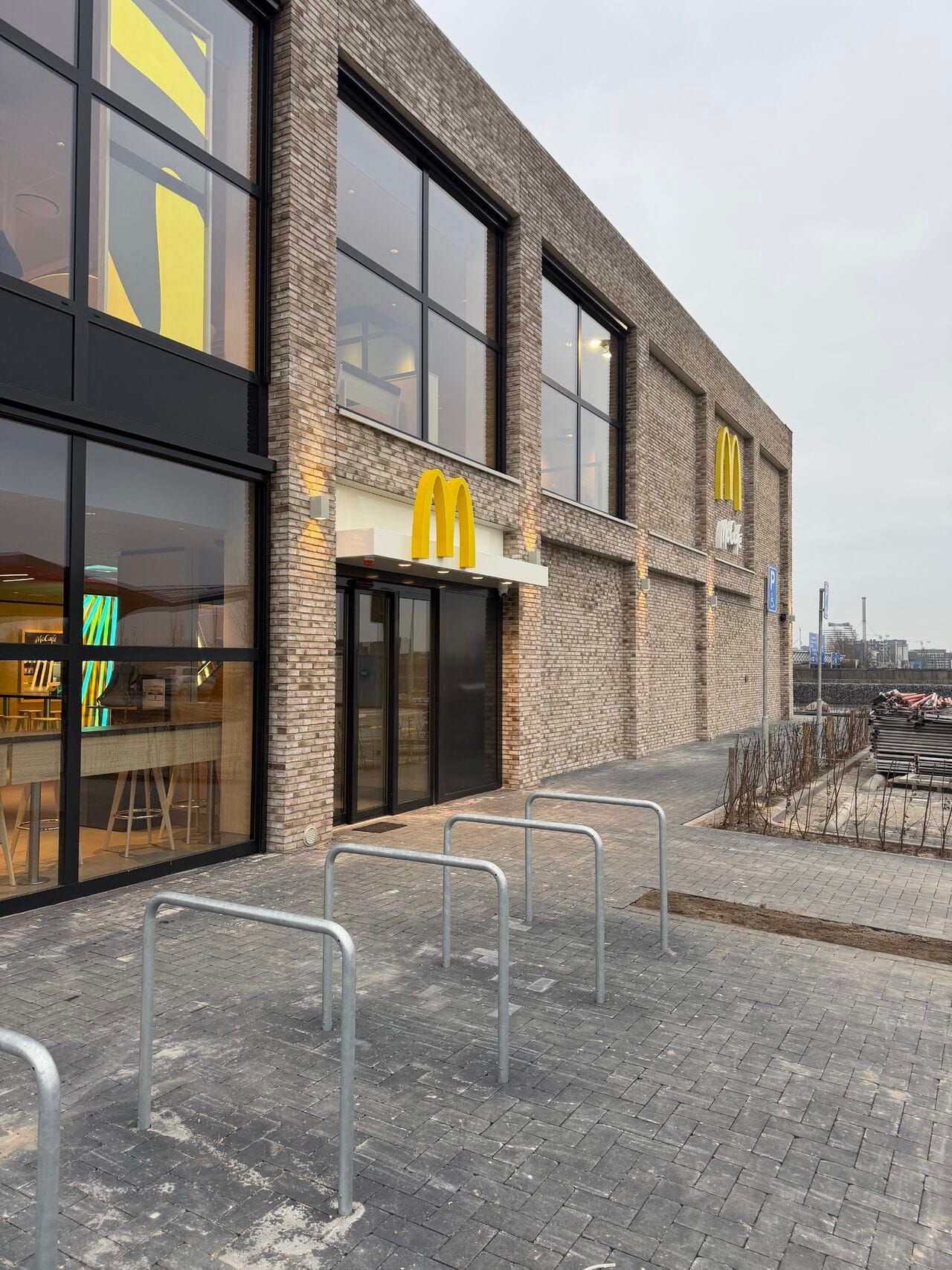 Параллельно с энергетической концепцией в проекте были реализованы дополнительные устойчивые решения. Здание полностью выполнено в кирпичной кладке — редкое решение для формата McDonald’s. Объект отличается тщательной проработкой деталей и высоким качеством строительных узлов.