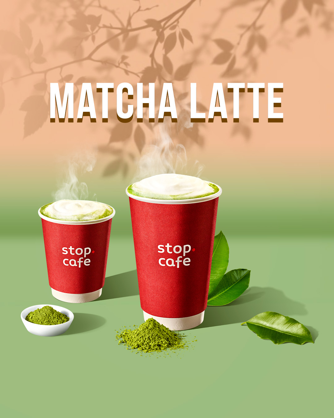 - Матча-латте — тонко молотый зелёный чай матча с горячим вспененным молоком. Выберите по вкусу малое или большое латте.