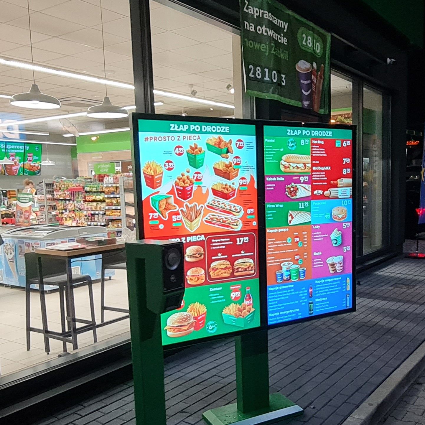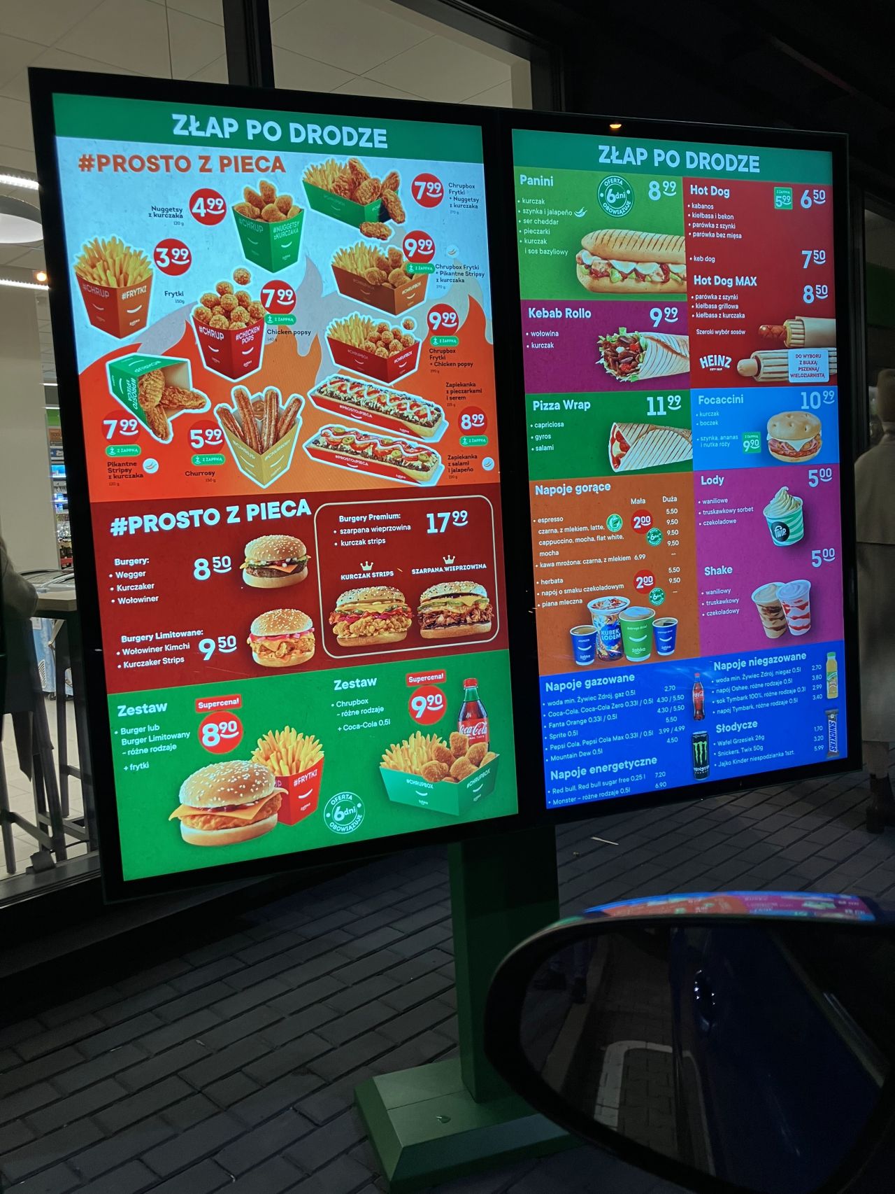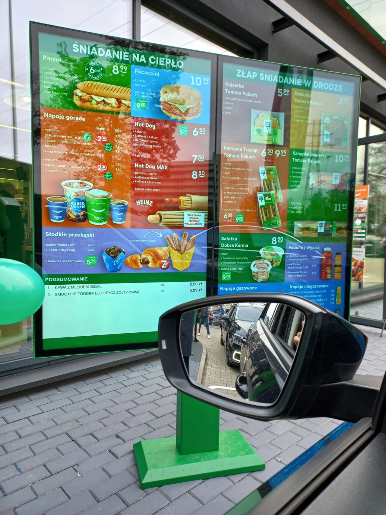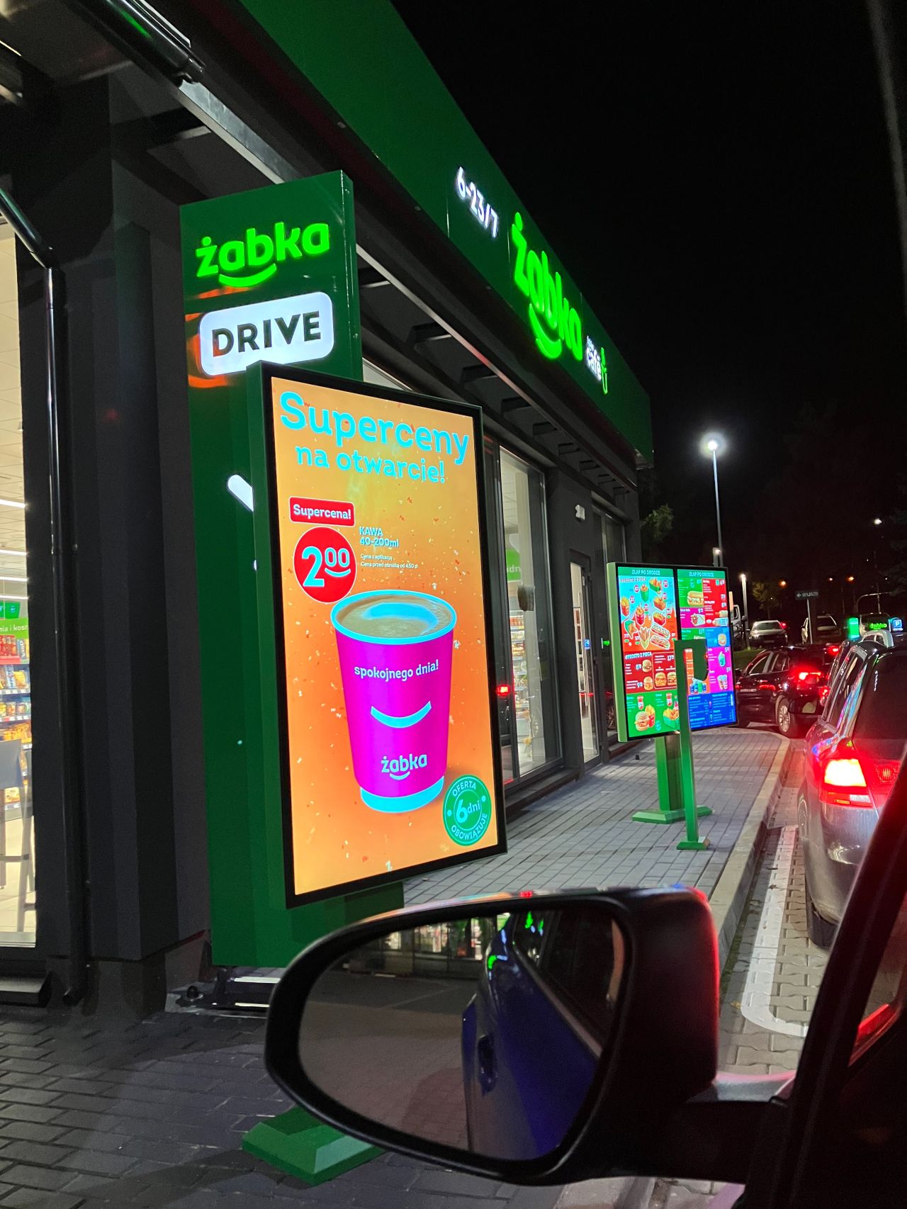 Żabka – на первом экране отображаются специальные акции. На следующем экране у вас есть время просмотреть весь ( ! ) ассортимент. И только потом, через две машины перед вами, вы можете сделать заказ. Для меня это принципиальное отличие. Когда вы останавливаете машину в McDonald's или KFC у экрана с меню, здесь же вы делаете заказ. Субъективно я чувствую, что в Żabka у меня больше времени для выбора.