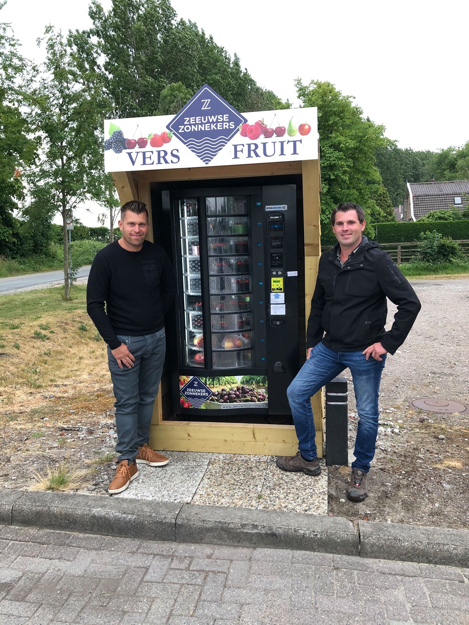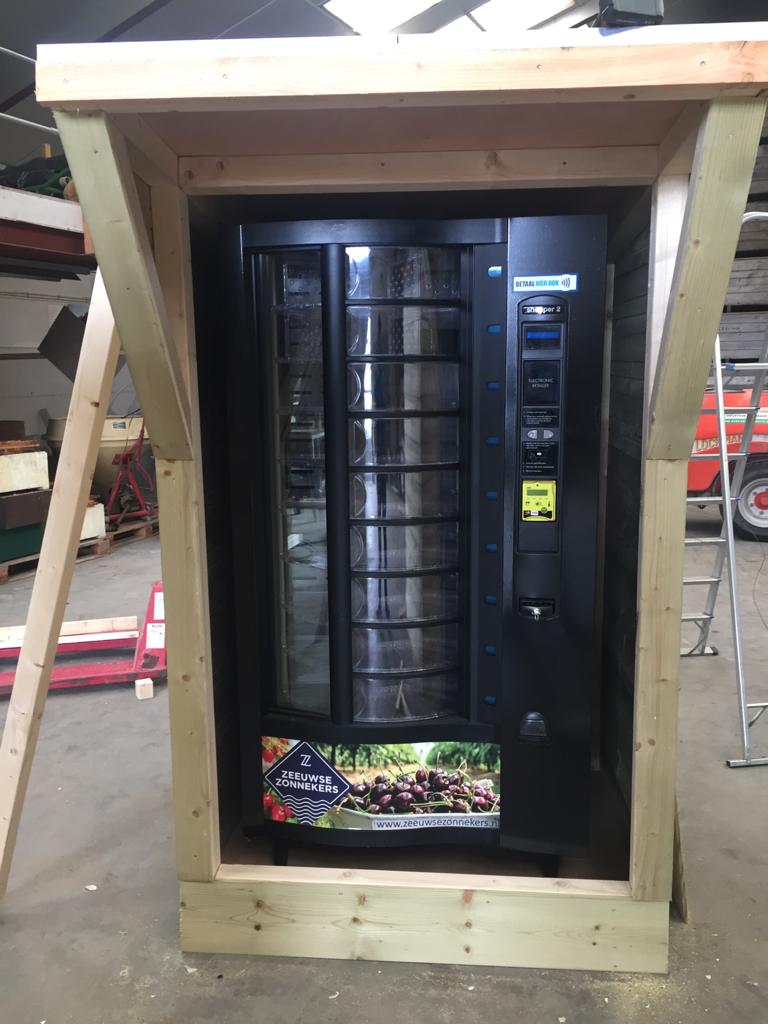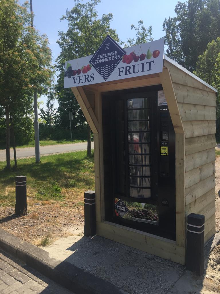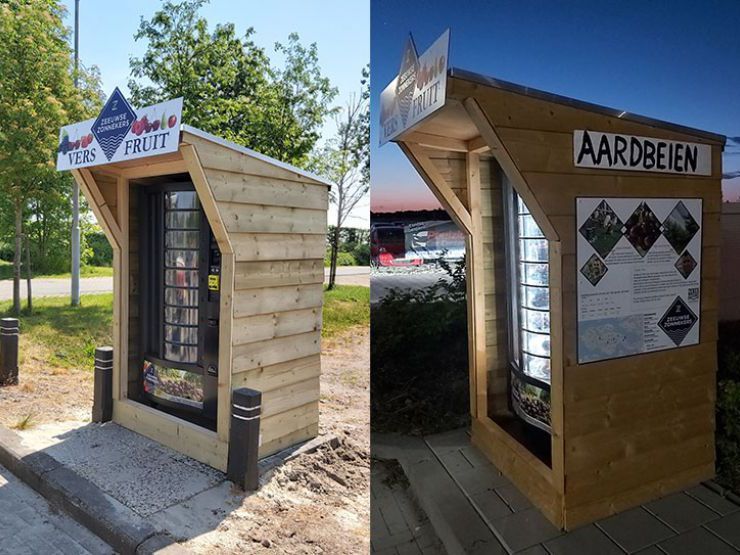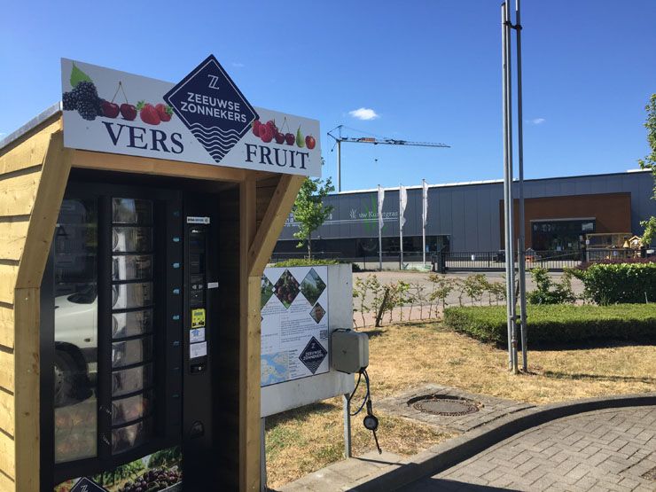 Концепция «фруктовых» торговых автоматов – здоровая альтернатива вендинговым аппаратам со снековой продукцией и напитками, которые широко распространены. Проект реализовали в сотрудничестве два молодых новатора-производителя фруктов и ягод – Йохан Эленбаас (Zeeland Zonnekers) и Тиджс ван Оверлуп (Maatschap Overloop).