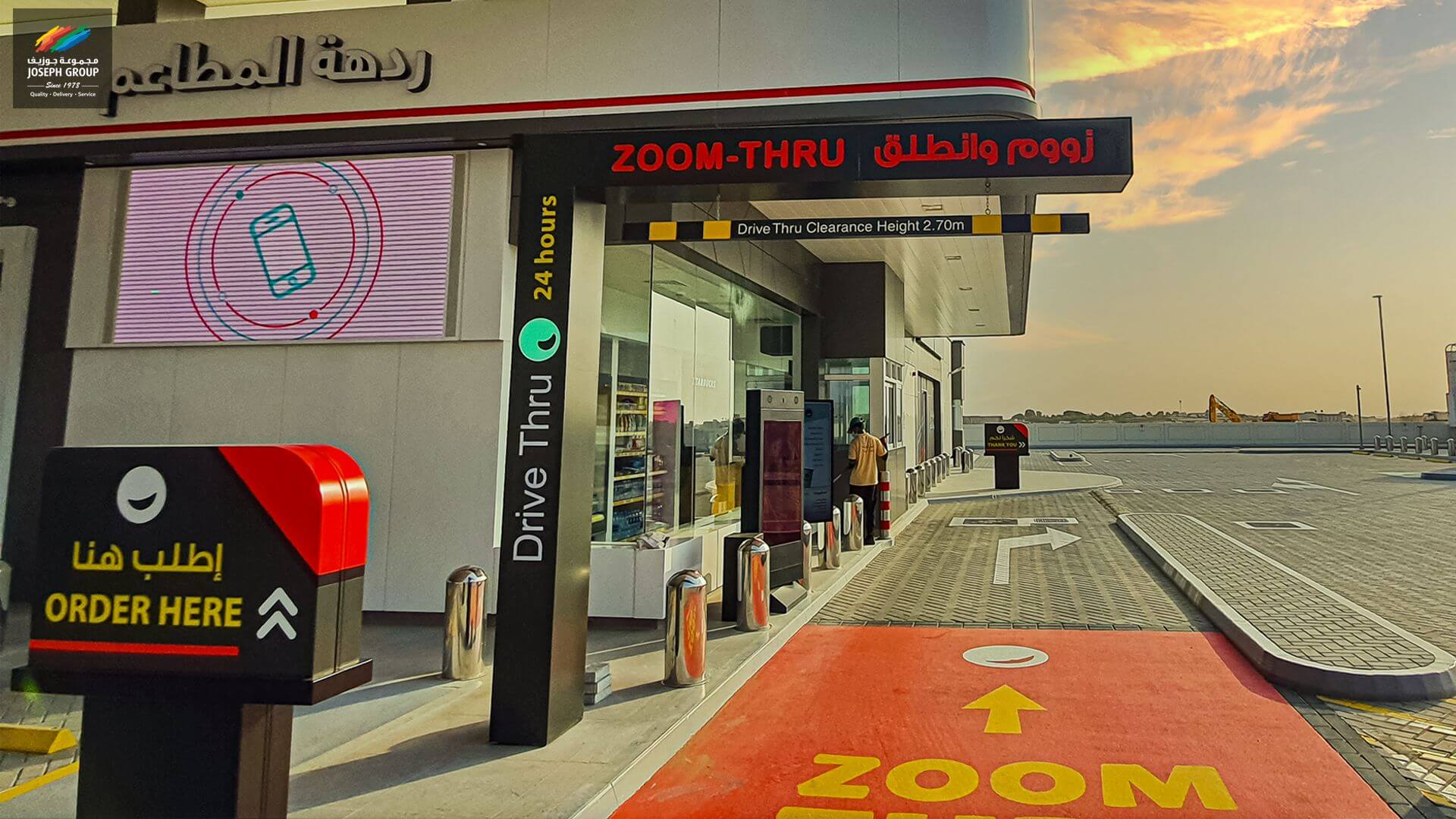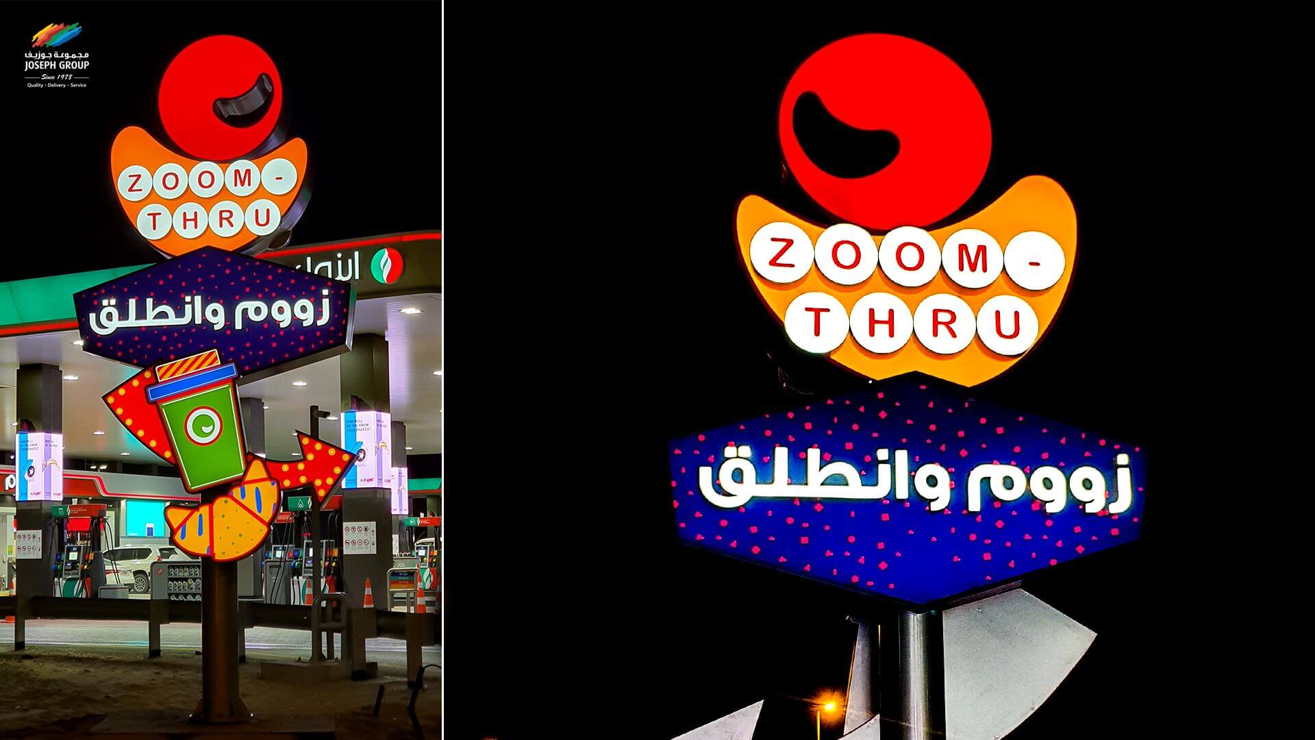 Компания Joseph Advertisers выполнила заказ на изготовление и установку рекламных конструкций – светового знака для проезда через консоль, указателей направления, красочного, яркого и привлекательного фирменного логотипа с вывесками ZOOM-THRU.